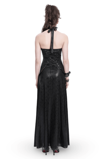 Edgy Halter Dress with Chains and Dark Aesthetic Cutouts This gothic-style maxi dress boasts a striking halter neckline with metal chain details and mesh cutouts for a bold, alluring vibe. The corset-inspired lace-up back flatters your figure, while the flowing...