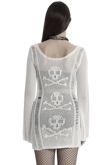 Long Sleeve White Mesh Knit Dress with Punk Skull Design