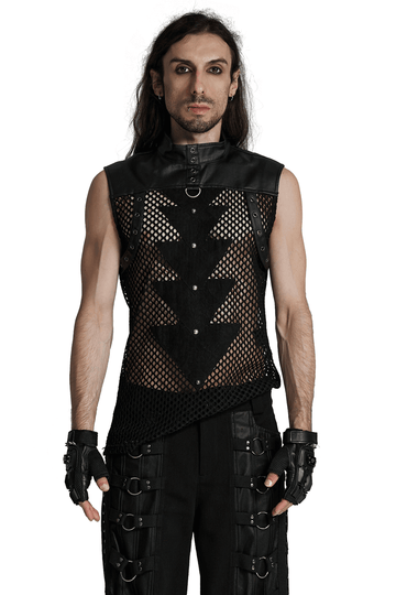 Edgy Punk Top with Mesh Panels and Leather Accents.  This bold vest blends mesh, rubberized twill fabric, and textured PU leather for a standout style. The front showcases a triangular splicing design with semi-circular rivet accents, adding to its edgy...