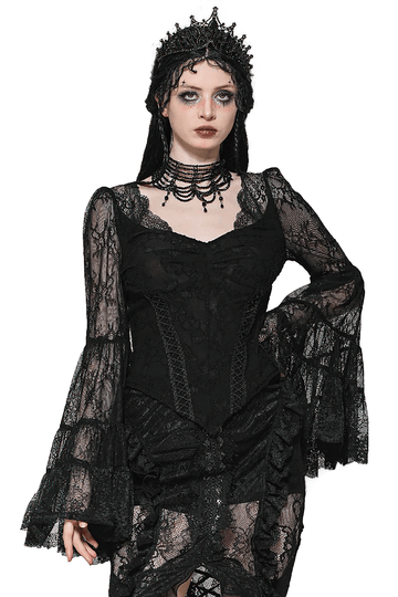 Gothic Black Lace Top with Bell Sleeves and Neck Chains