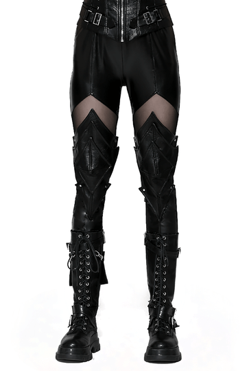 Edgy Gothic Leggings with Sheer Mesh Panels - Bold Look. These black PU leather leggings make a striking addition to your gothic collection. Crafted from durable faux leather, they feature mesh panels for an edgy touch. Knee armor accents enhance...