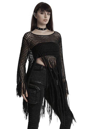 Gothic Knit Sweater with Hollow-Out Design and Edgy Tassel Fringe  Step up your gothic style with this bold tassel knit sweater dress. Made from soft yarn, it features a unique weave and a pointed front to accentuate the waist. The...