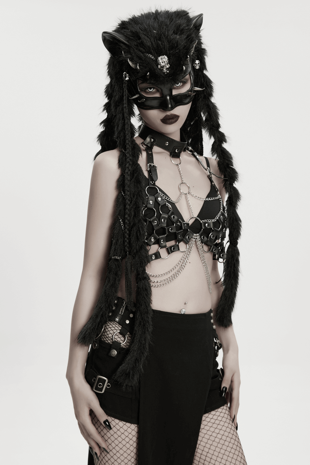 Punk Fox Mask Hood with Braided Plush, Chains, and Latex Details