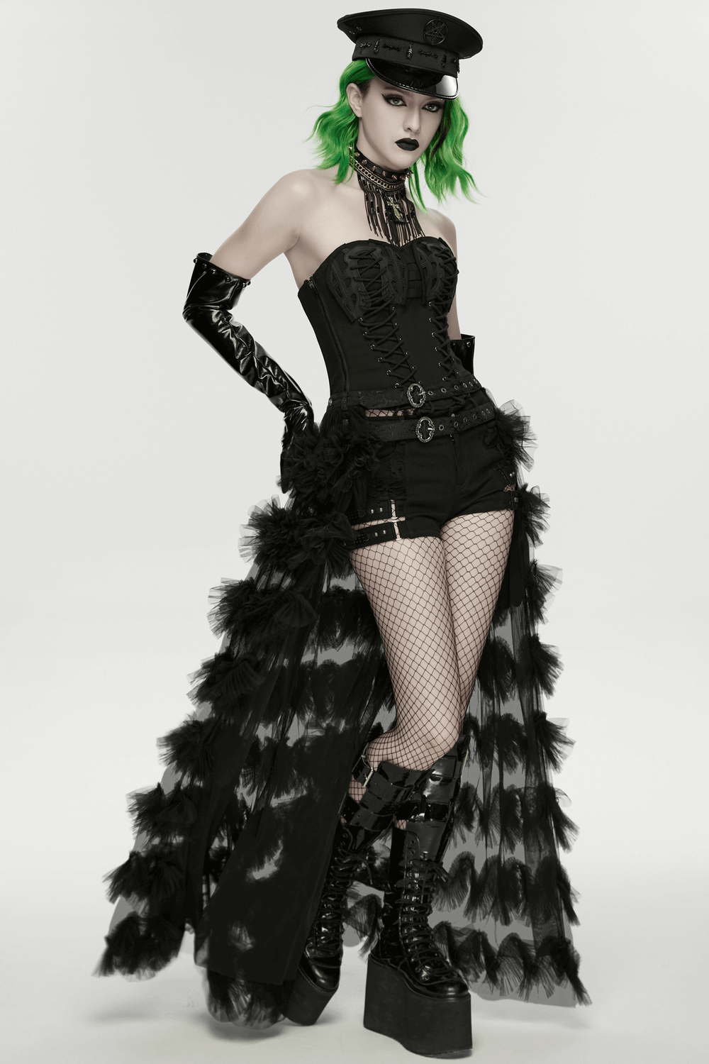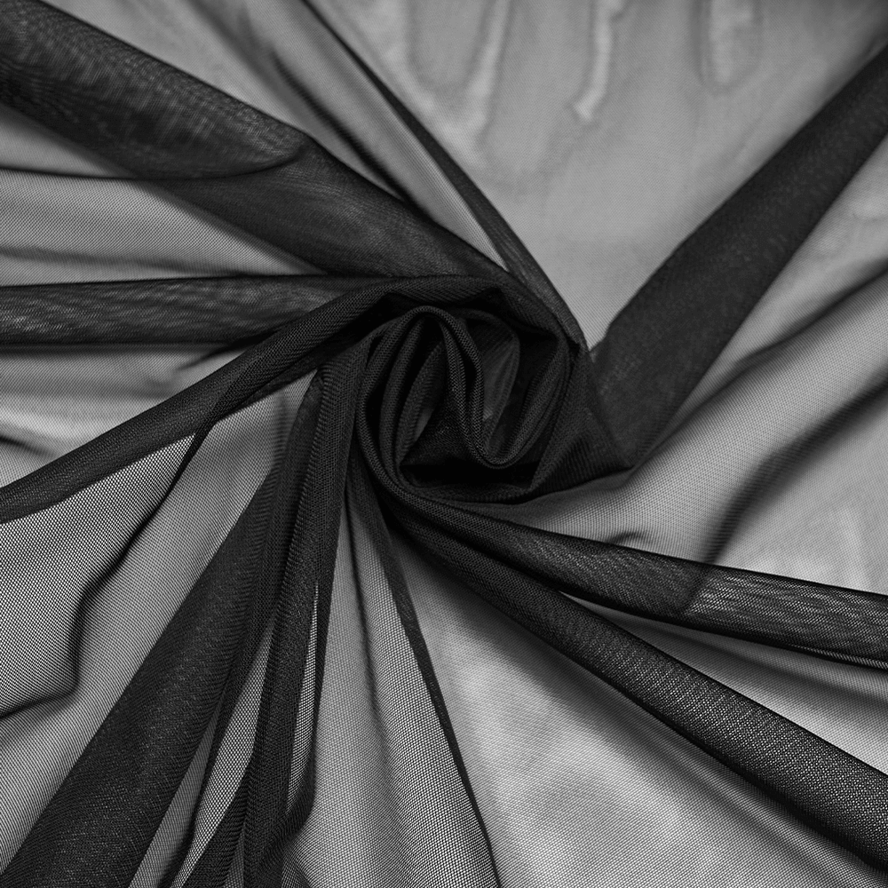 Turn heads in a dramatic goth maxi skirt crafted from mesh and jacquard fabric. The silhouette breaks the usual straight line with a wave-cut, layered design for stronger visual impact. A stiff mesh lining helps the skirt keep its bold volume, while the elastic jacquard double waistband creates a striking layered focal point at the waist. Style it in bodysuits or boots for club and festival nights!