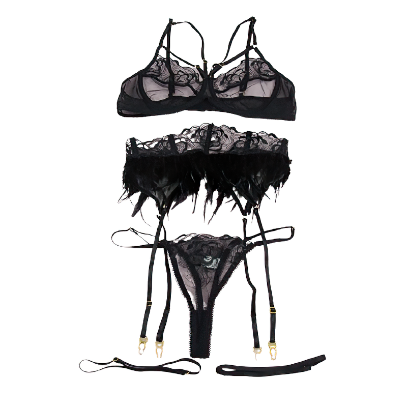 Sexy Dessous-Unterwäsche für Damen mit Federn/exotischer Spitze, Damenbekleidung mit Strumpfbändern und BH-Set