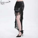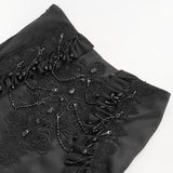 Elevate your gothic style with this striking black skirt, adorned with delicate floral embroidery and daring lace-up accents. Its high-waisted silhouette is enhanced by fringe and beaded details, offering a bold, dramatic edge. A seamless blend of gothic, punk, and romantic elements, this versatile piece pairs well with countless tops—ideal for turning heads at daily outings or unforgettable occasions.