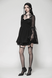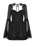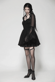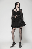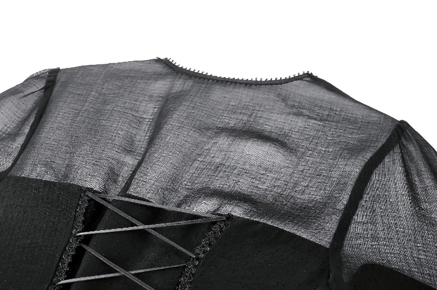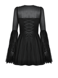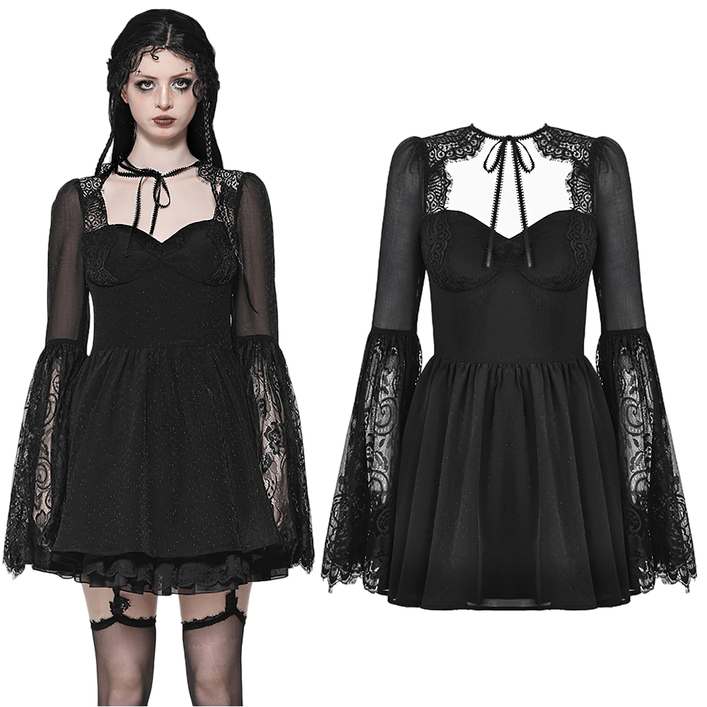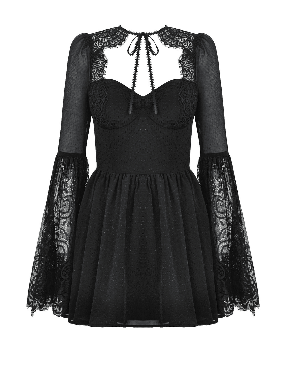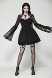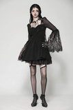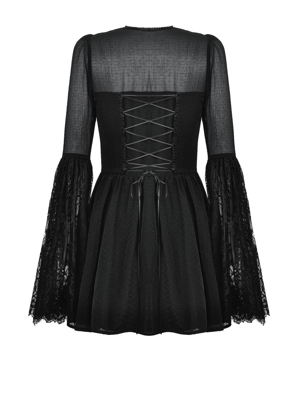 This gothic dress boasts bell sleeves, a corset lace-up back, and a sheer mesh upper. The lace-trimmed neckline and dotted fabric add romance, while the bustier front and flowing skirt create a dramatic silhouette, blending Victorian charm with modern dark style.