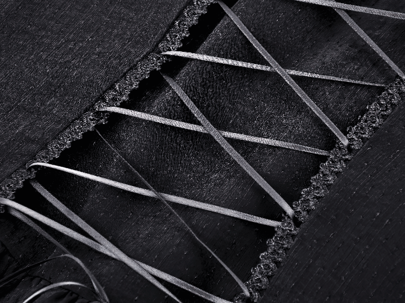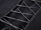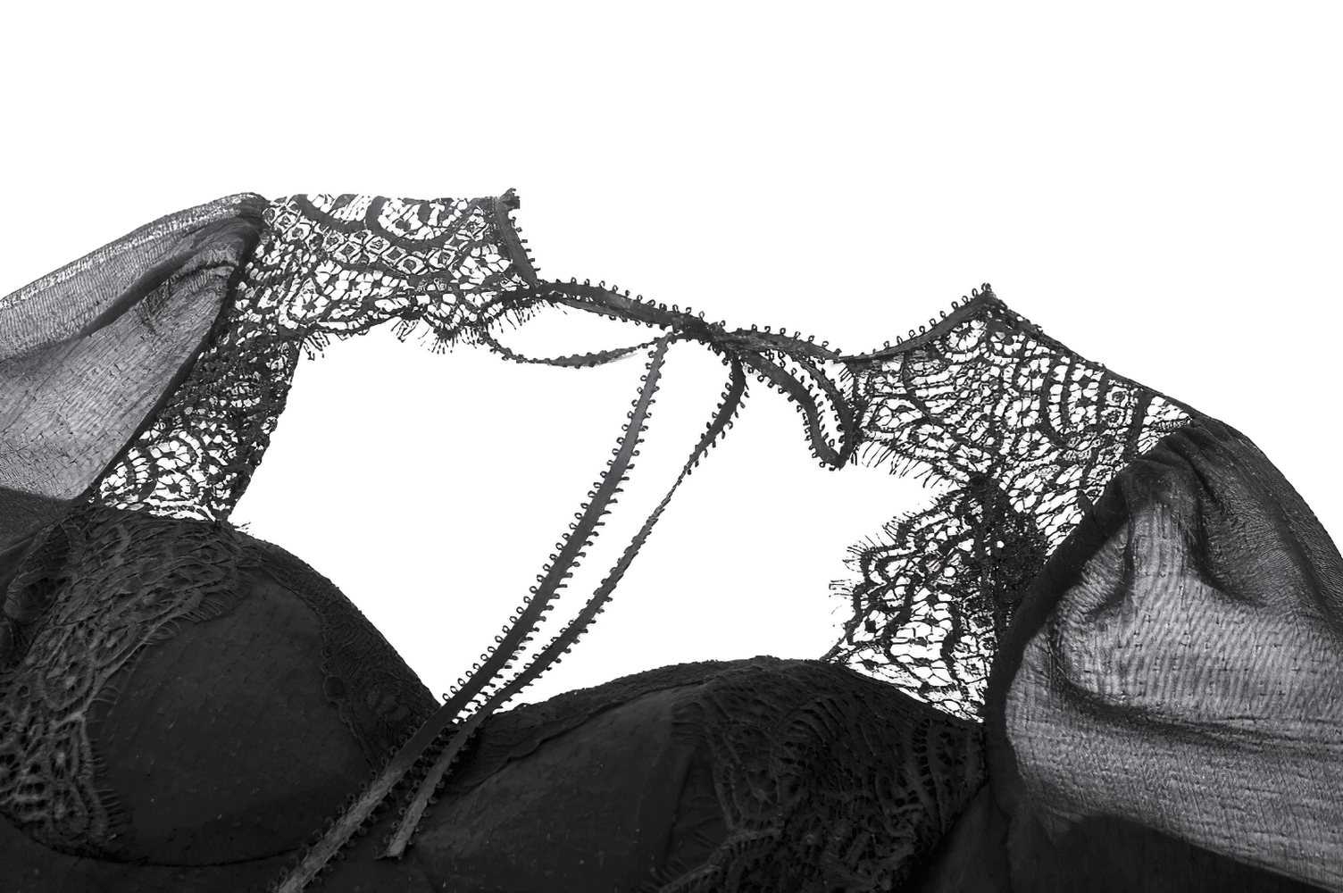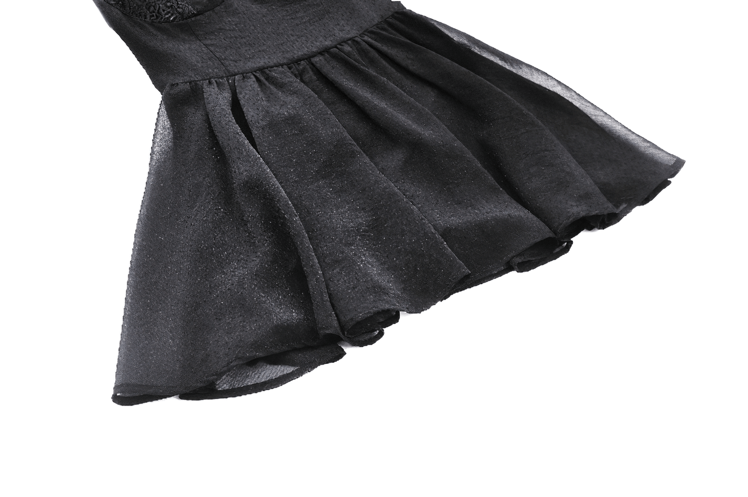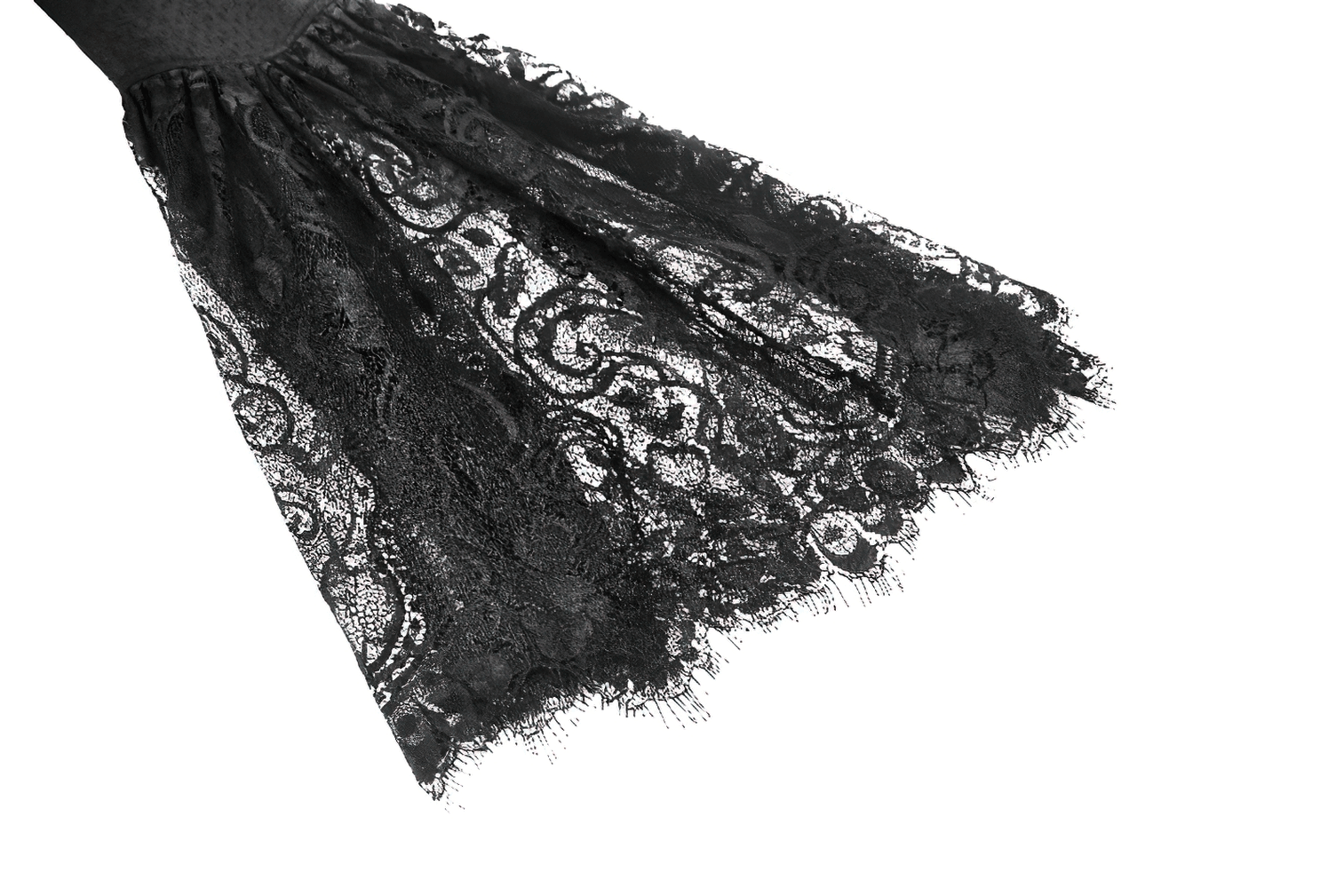 This gothic dress boasts bell sleeves, a corset lace-up back, and a sheer mesh upper. The lace-trimmed neckline and dotted fabric add romance, while the bustier front and flowing skirt create a dramatic silhouette, blending Victorian charm with modern dark style.