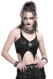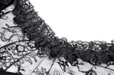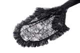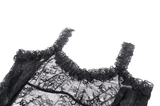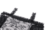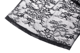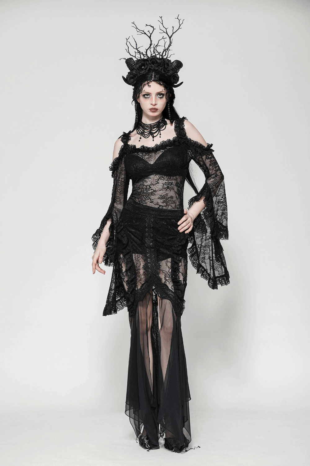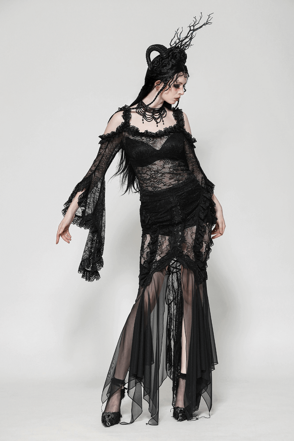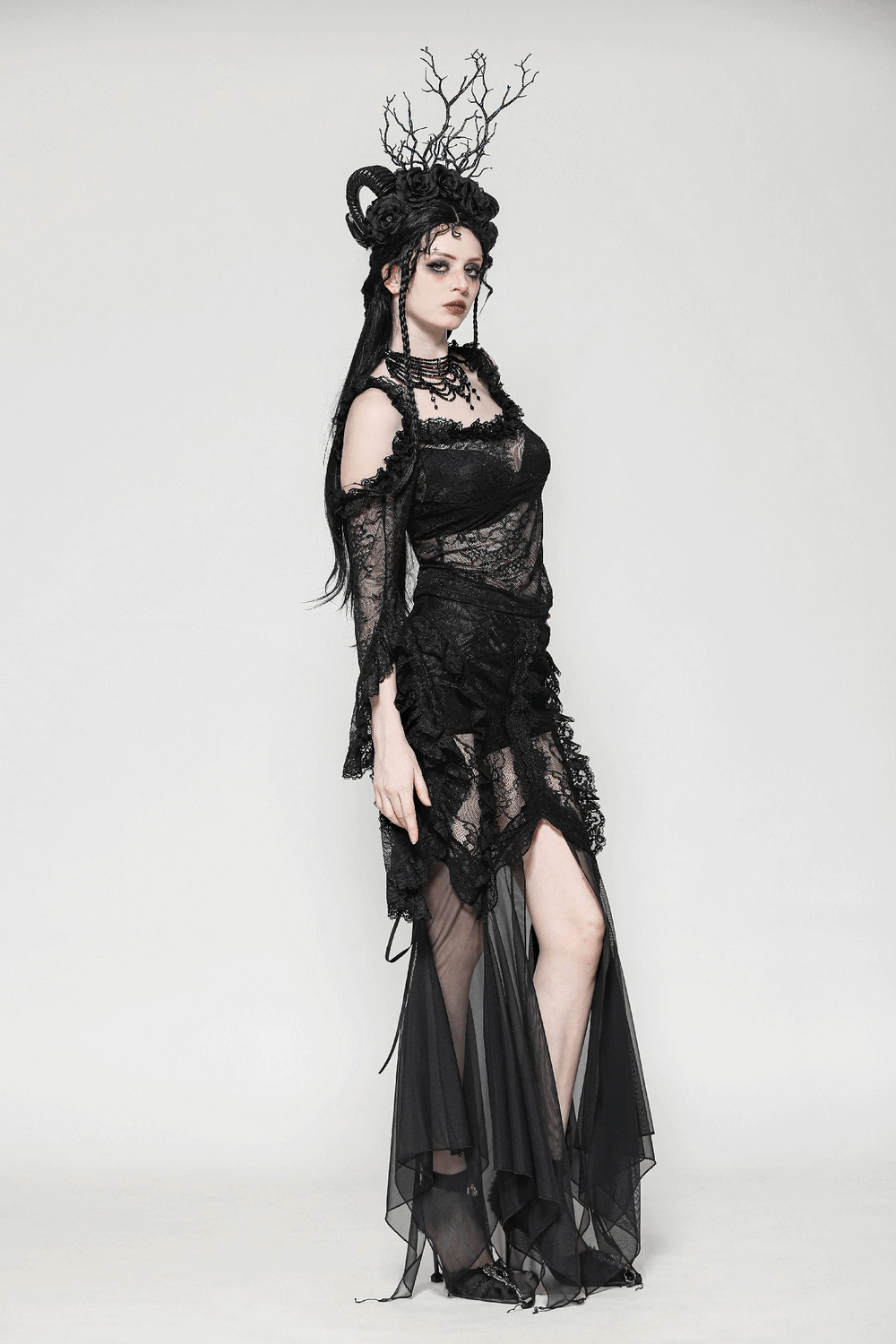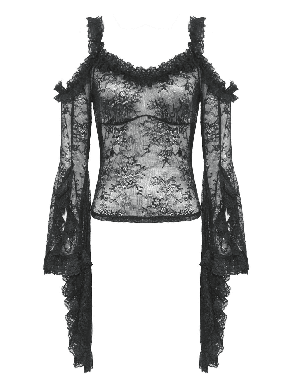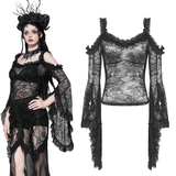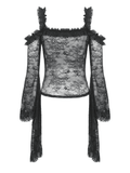 Reveal your gothic charm in this sheer black lace top, designed with an off-shoulder cut and soft ruffle edging for a Victorian-inspired touch. Its flowing bell sleeves add a mystical, dreamy effect, ideal for witchy, romantic, or dark fashion styles. Style it with corsets, layered outfits, or flowing skirts to create a bold and enchanting look with timeless appeal.