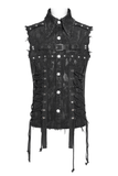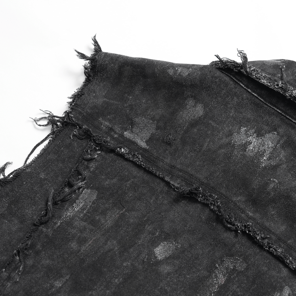 This black gothic denim shirt is a standout piece, featuring lace-up sides, silver studs, and frayed edges. Ideal for alternative fashion enthusiasts, it fuses punk and gothic styles with a contemporary twist. Pair it with jeans, skirts, or shorts for a bold look that makes a statement wherever you go.