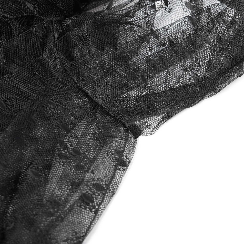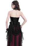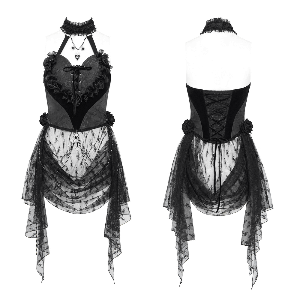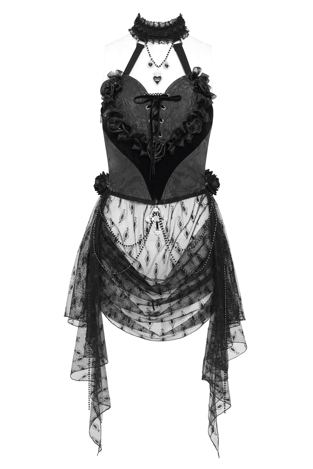 This halterneck gothic top showcases an ornate lace design with refined detailing. The bodice blends velvet and lace textures, while the bust is highlighted with lace roses for a romantic accent. A cascading black lace skirt adds movement, styled with layered draping for dramatic effect. Silver chains drape across the design, giving a bold and edgy gothic vibe. A statement piece perfect for gothic enthusiasts and striking evening outfits.