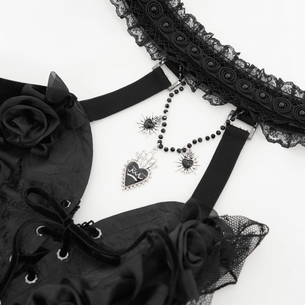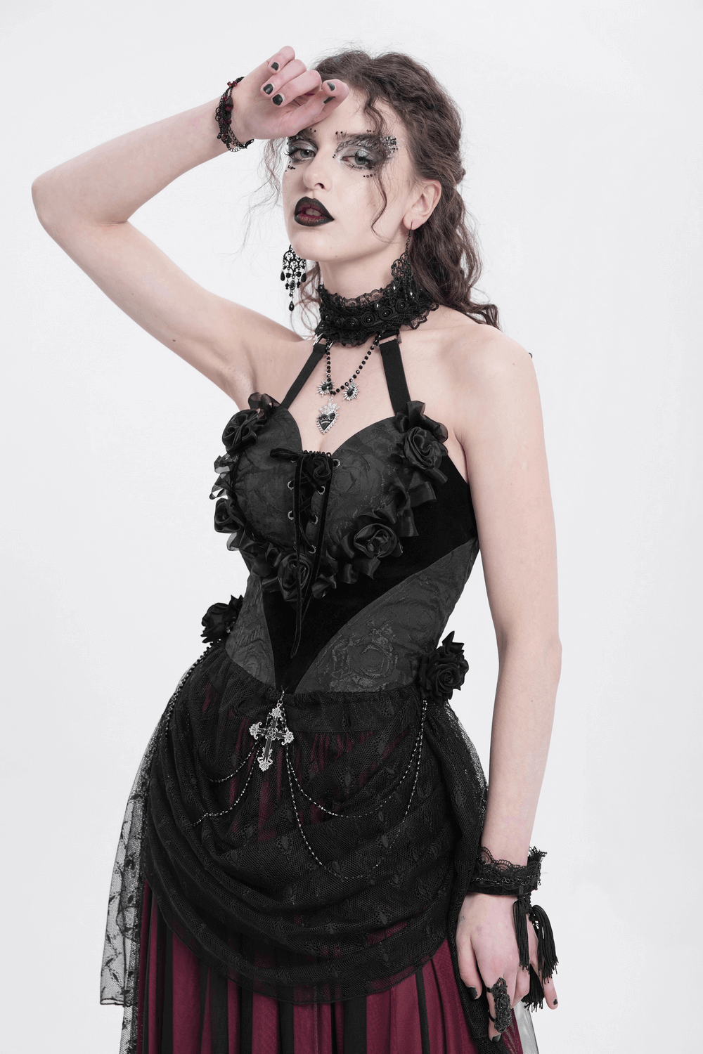 Gothic Black Lace Halter Top with Rose Details and Chains