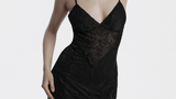 Made from soft elastic lace and knitted fabric, this black gothic maxi dress combines elegance and allure. The deep V-neck with detailed lace stitching highlights femininity, while the high slit with ruffled edges creates a bold silhouette. The adjustable corset back offers a customized fit. Ideal for gothic fashion enthusiasts.