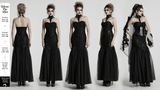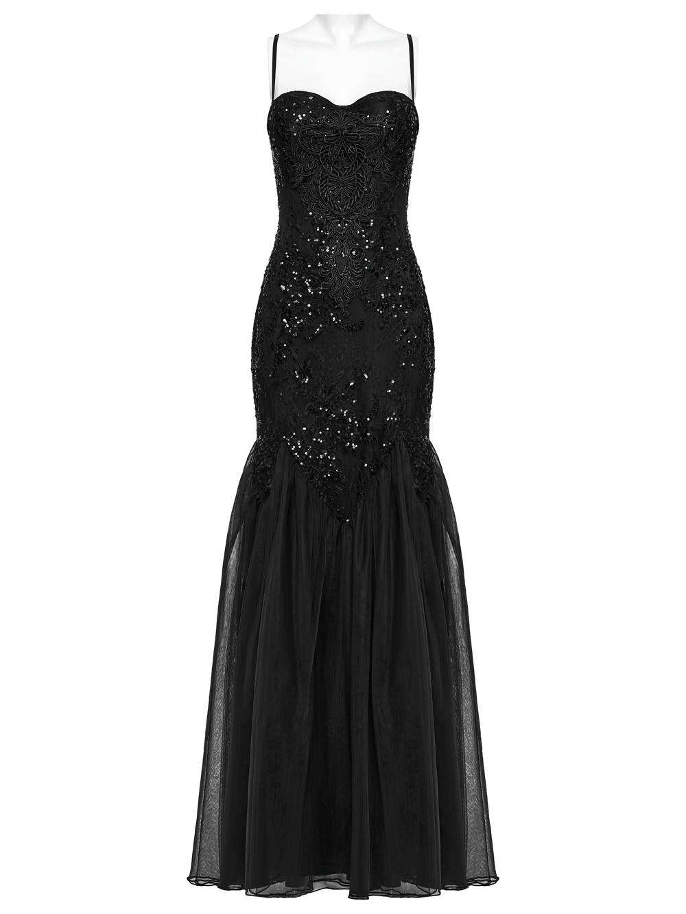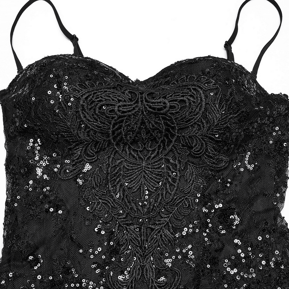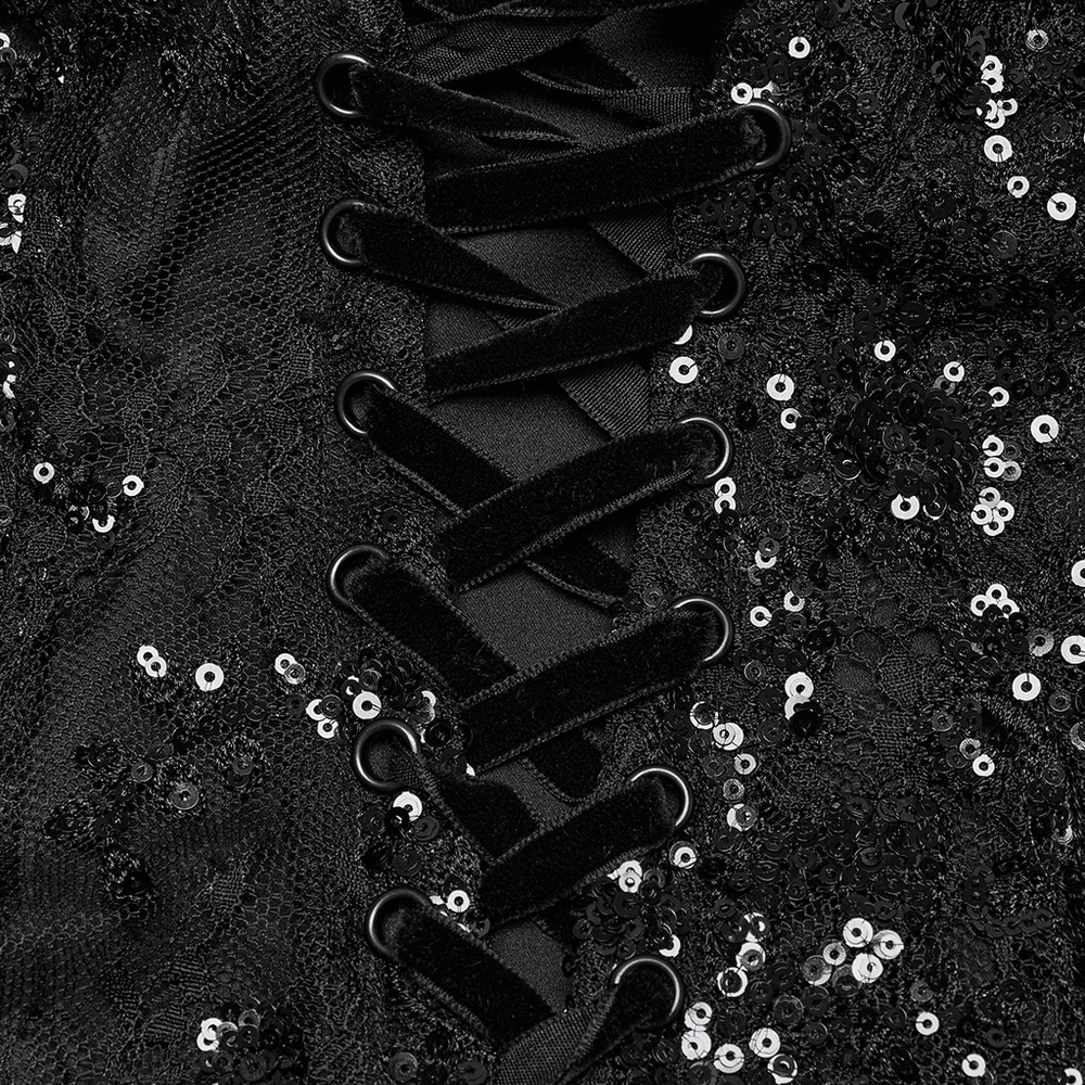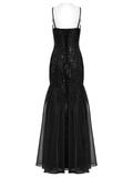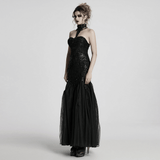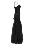 This gothic maxi dress combines sequin floral lace with soft gauze for a striking silhouette. Elegant retro floral designs and bead accents elevate its charm. A Baroque-style appliqué decorates the front, while the layered gauze skirt adds a dreamy touch. Finished with adjustable straps and corset-style back lacing for a perfect fit.
