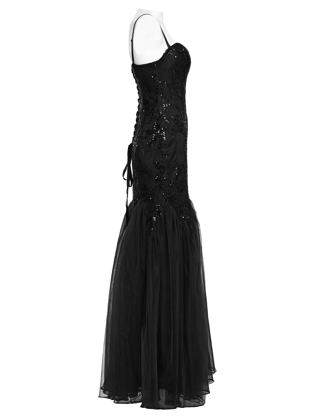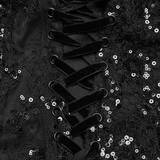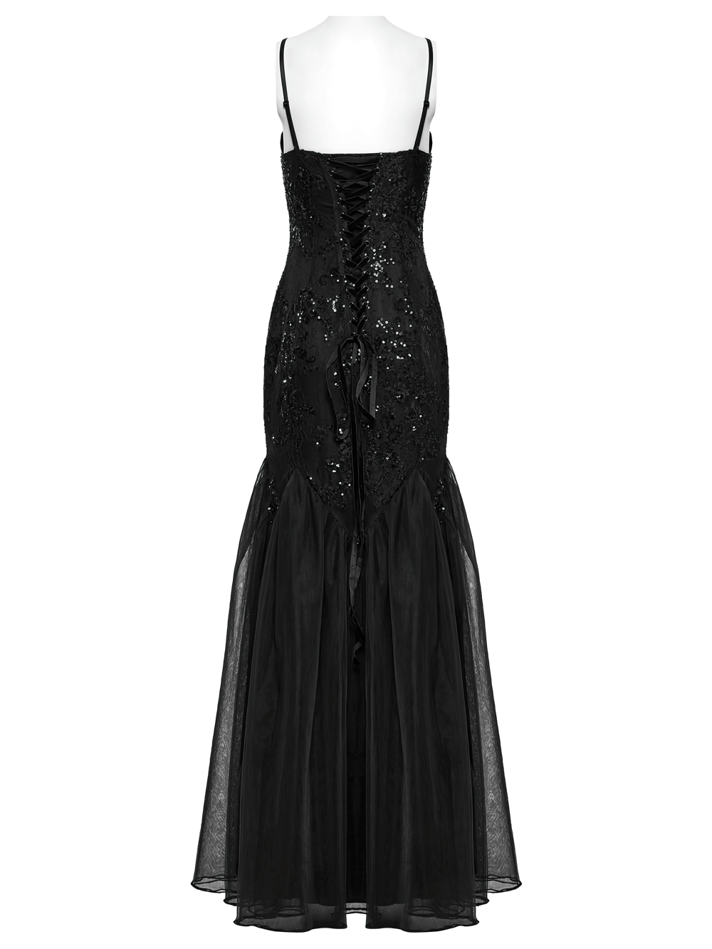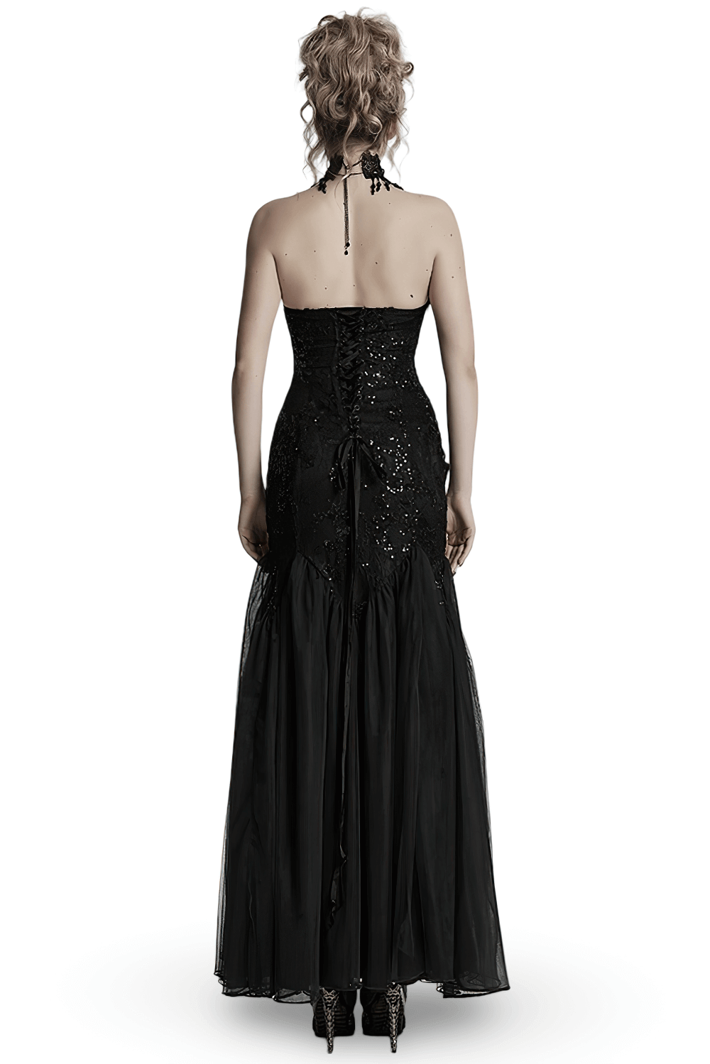 Gothic black strapless maxi gown with sequin lace, gauze skirt, and corset lace-up back detail.