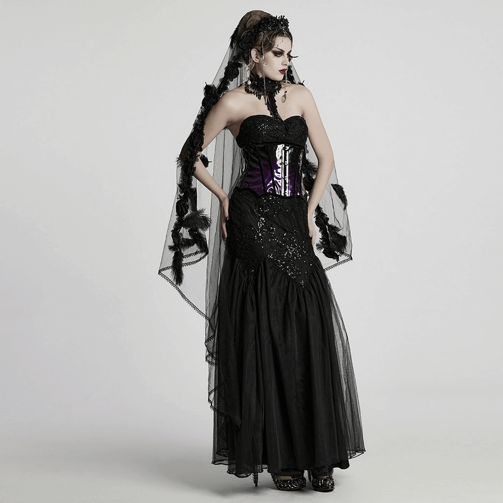 Gothic Black Lace Strapless Maxi Gown with Sequin Details