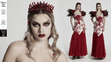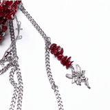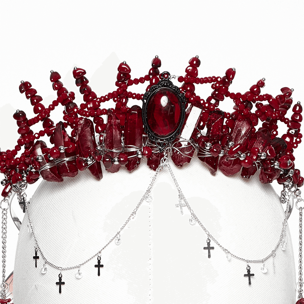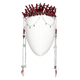Crafted from natural and irregular stones, this Gothic crown features a radiant red simulated gemstone at the center. Silver chain tassels on each side enhance its dramatic elegance, offering a luxurious and mysterious touch. Perfect for lovers of Gothic and alternative fashion, this handmade accessory makes a bold and enchanting statement.