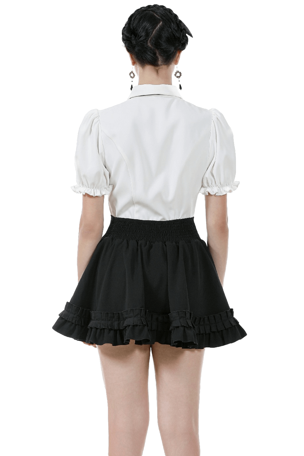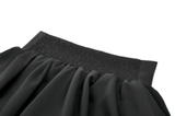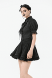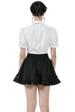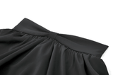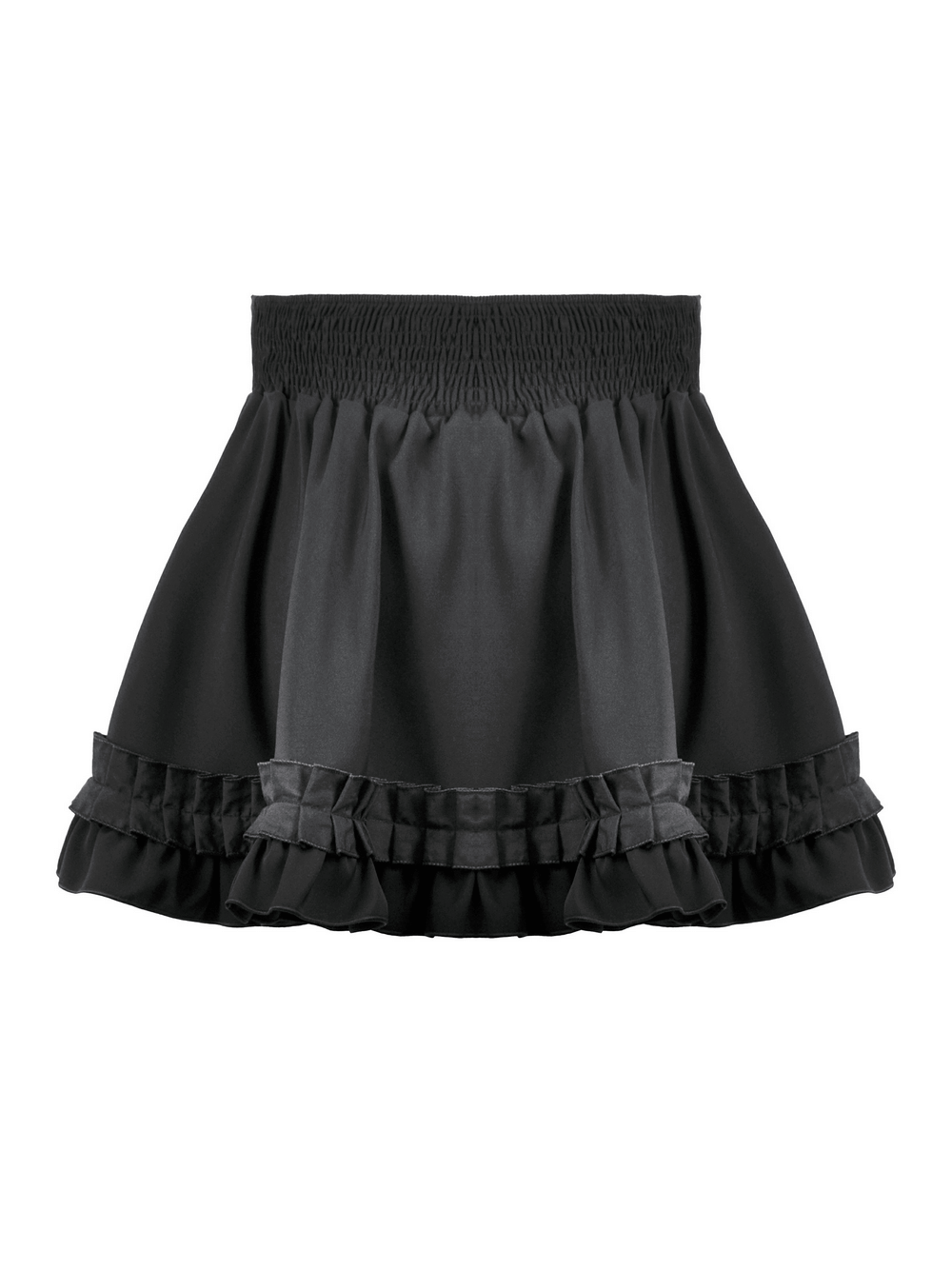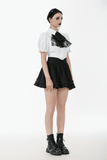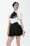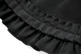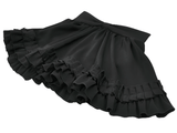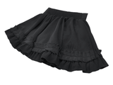 Enhance your Gothic or Lolita look with this ruffled mini skirt, featuring satin layers, a bold front bow, and pleated details. The elastic waistband provides a flattering fit, while the double ruffle hem adds volume and texture. Pair this versatile black skirt with corsets, lace tops, and boots for a striking gothic or kawaii style, perfect for any time of day or night.