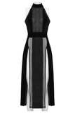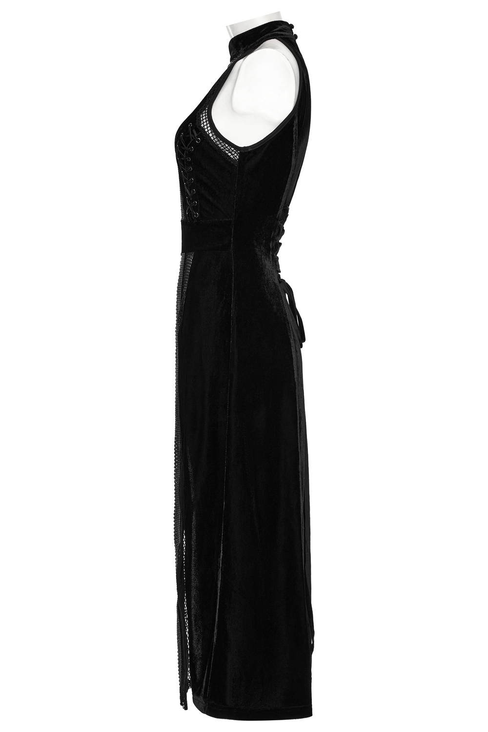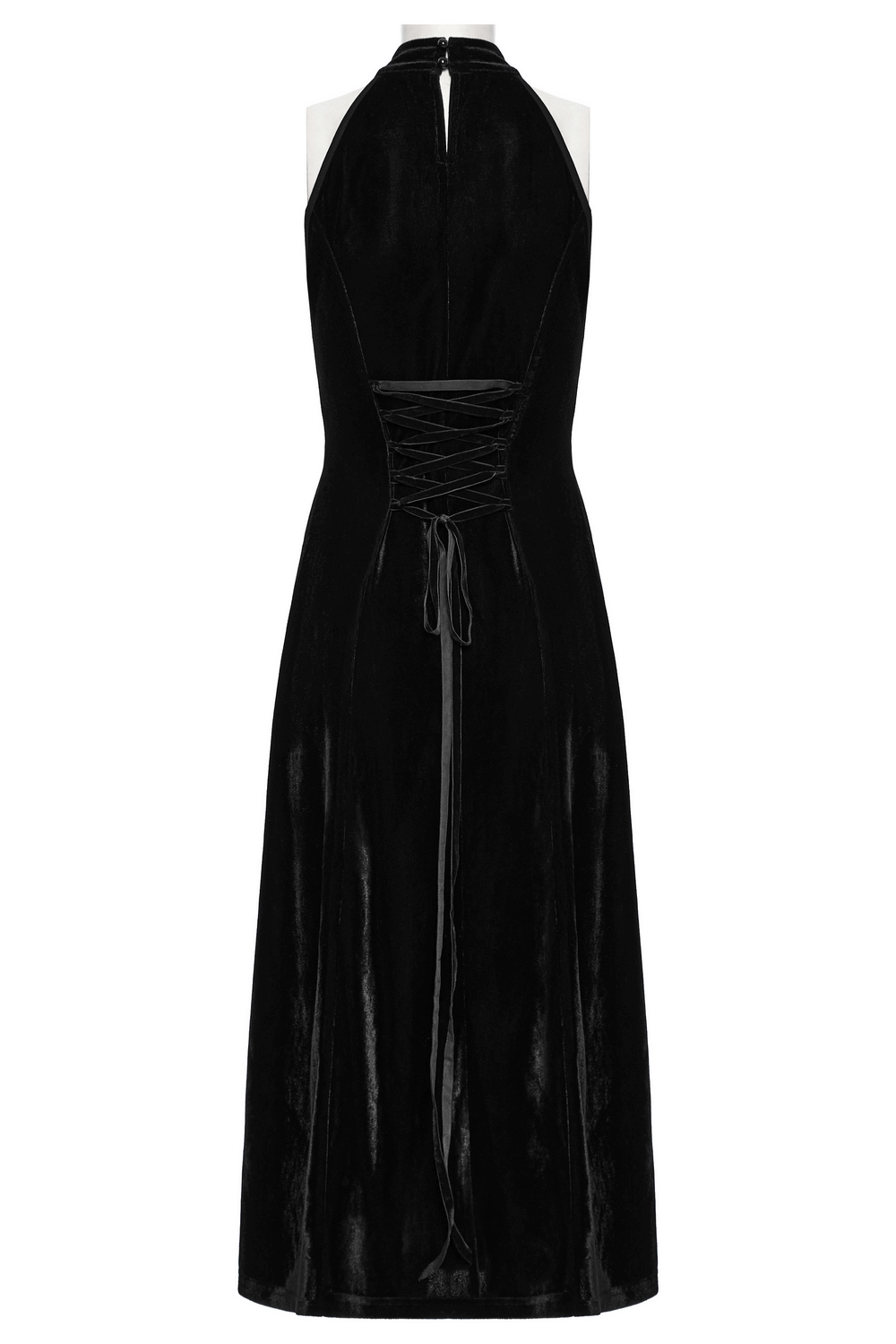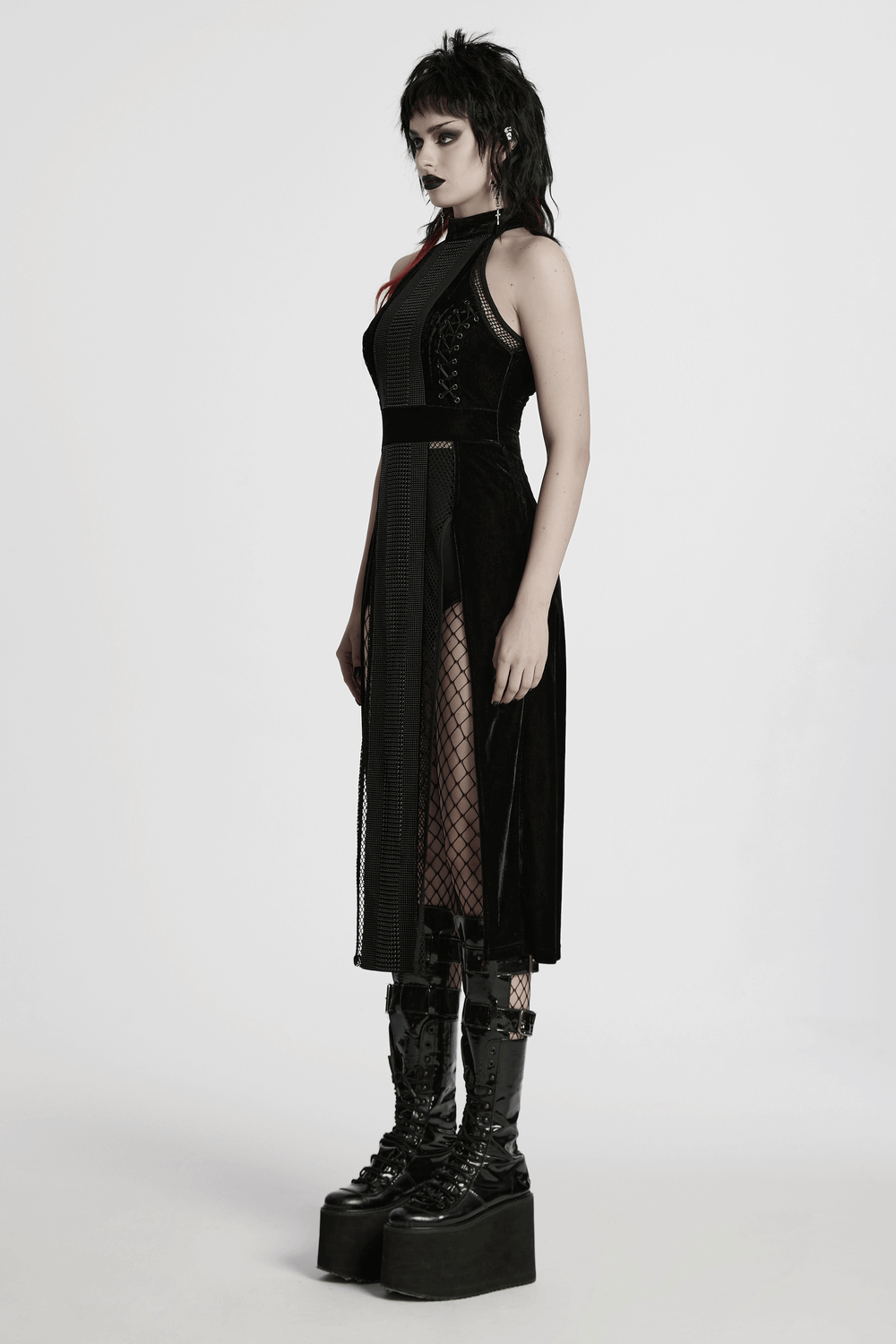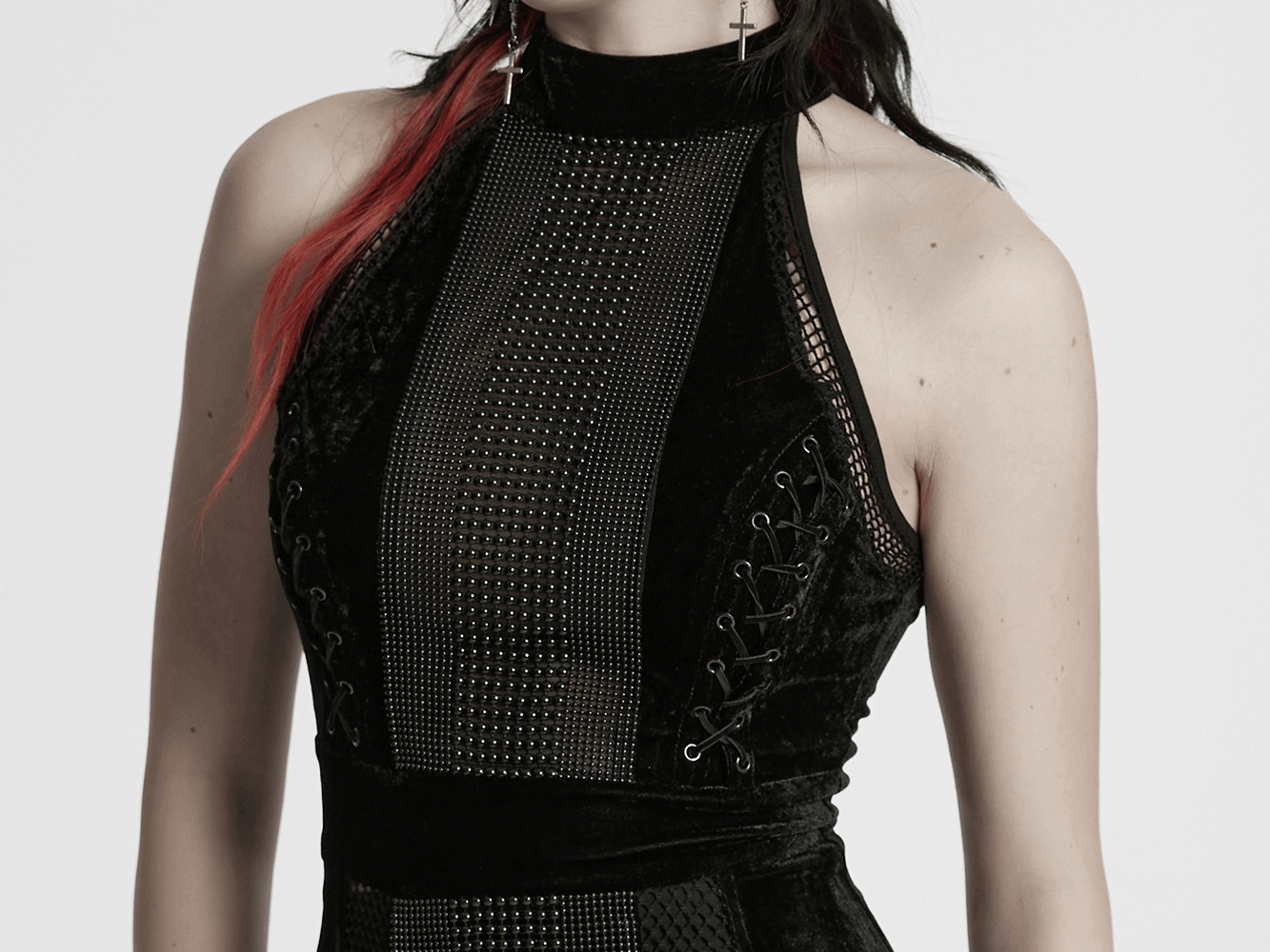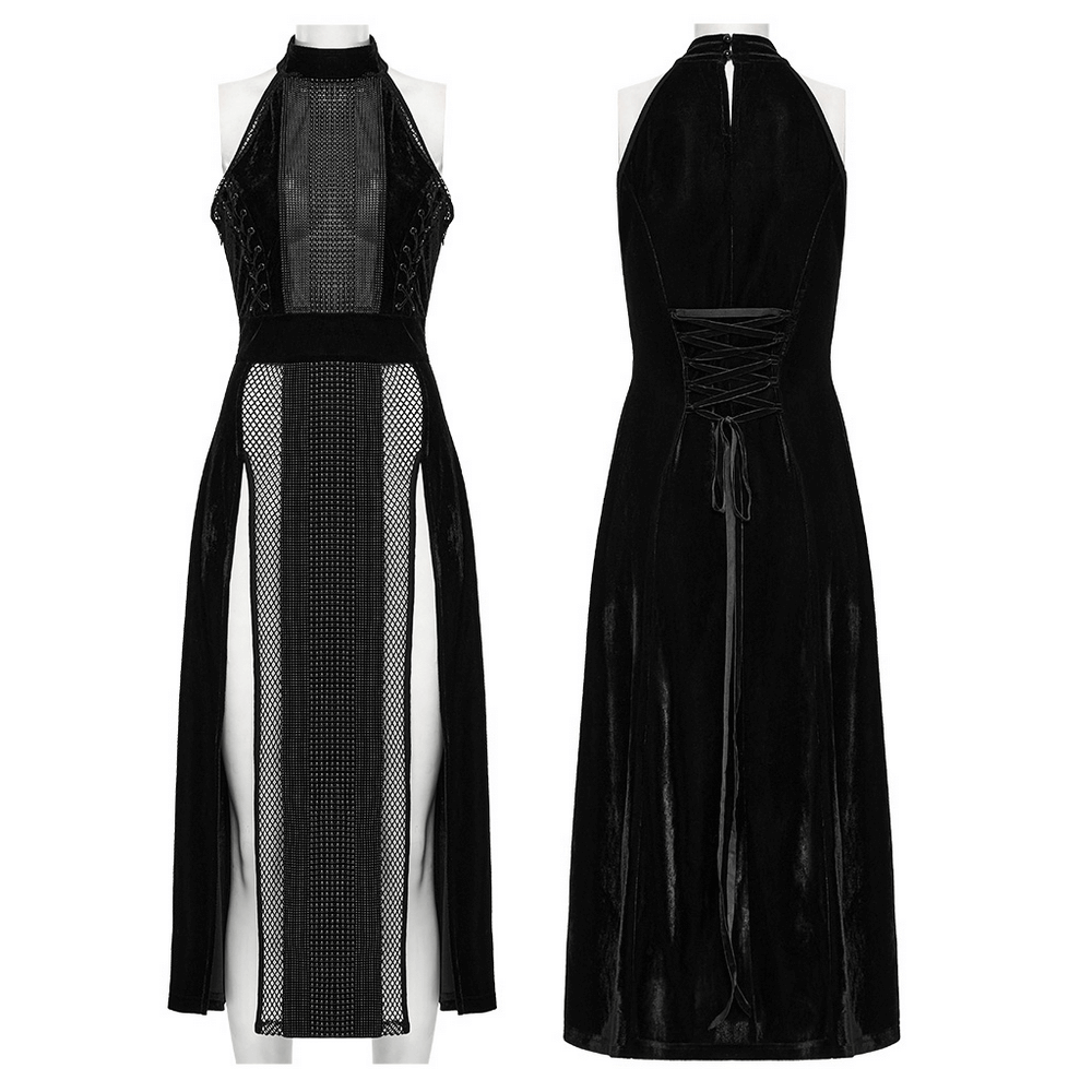 Gothic velvet mesh halter neck dress with bead details, lace-up back, sheer panels, and high side slits.