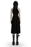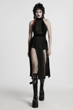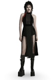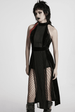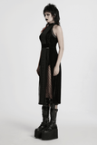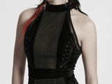 This gothic long dress combines elastic velvet and mesh, with a halter neck and form-fitting design. Bold bead accents on the front create a striking look. Sheer mesh panels and a high slit exude allure, while the lace-up back amplifies gothic appeal. Ideal for dark fashion evenings and daring alternative statements.