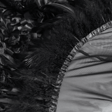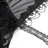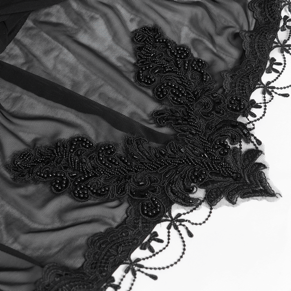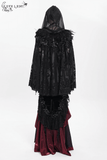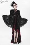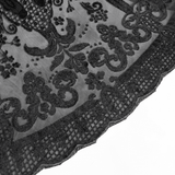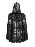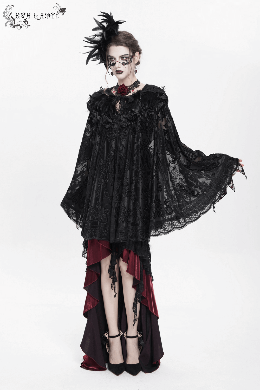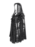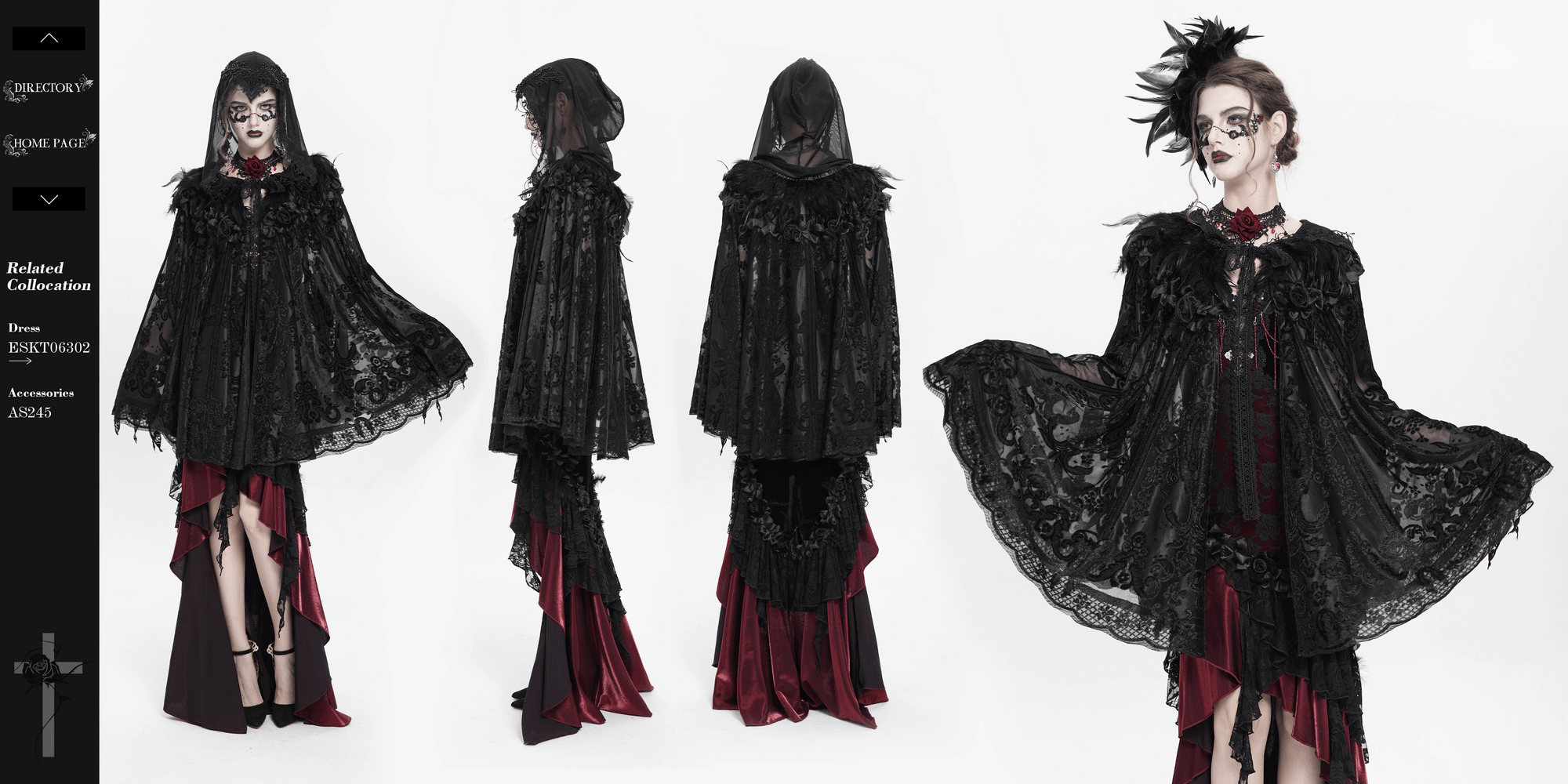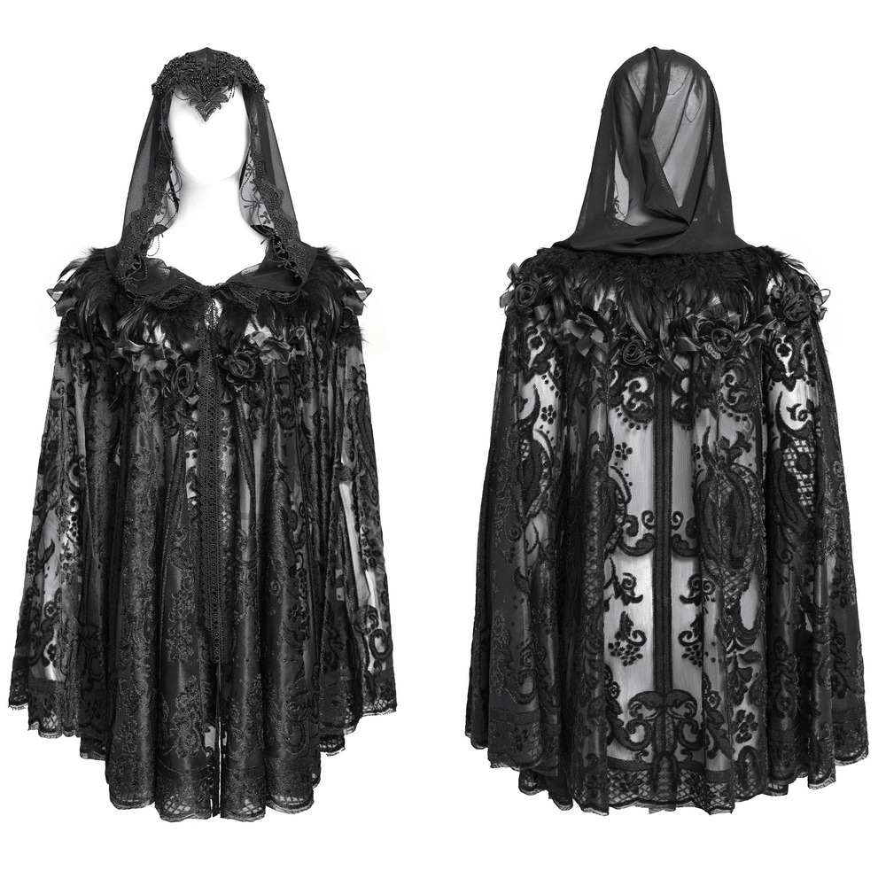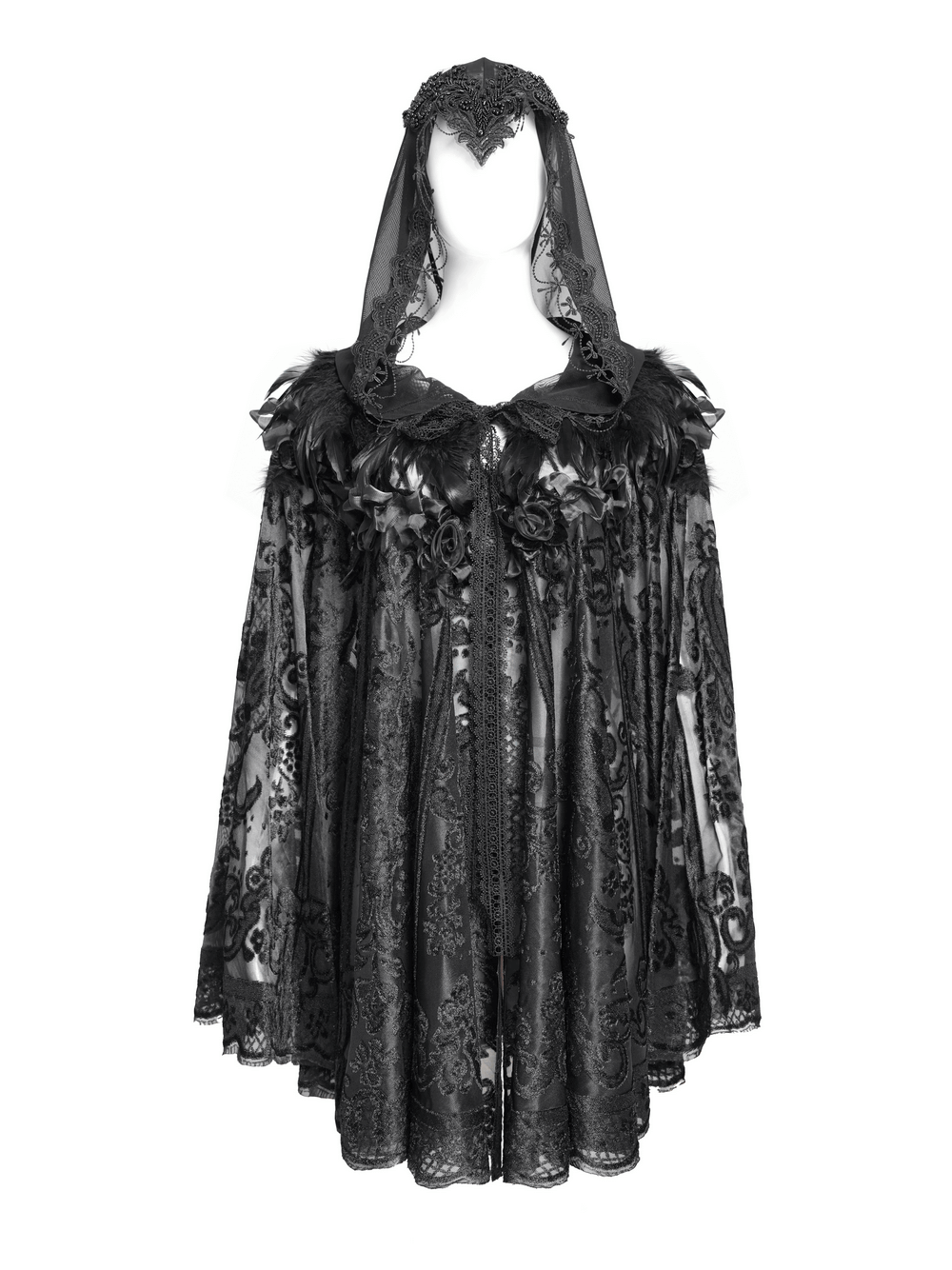 This elegant Gothic cape in black lace showcases a detailed floral motif, accented with roses and soft feather trim along the neckline. Its attached hood creates a mysterious aura, while the flowing lace brings drama to your outfit, making it perfect for Gothic, Victorian, or witchy aesthetics. A striking choice for evening wear, special occasions, or alternative statement looks.