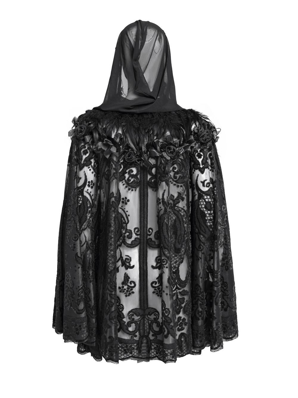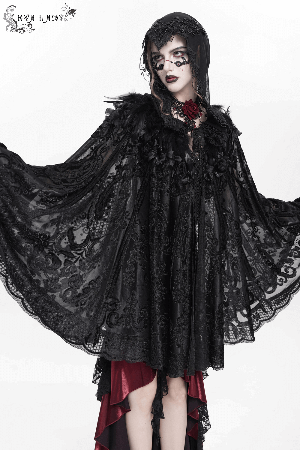 Graceful Lace Cape with Roses and a Gothic Hood Trimmed in Feathers
