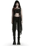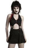 This gothic halter neck top blends elastic mesh and lace for a bold yet refined look. Featuring intricate lace detailing along the collar and front, it highlights pleated chest accents. The layered design adds depth, forming a striking silhouette. With an invisible zipper for easy wear, this top is an essential piece for any gothic-inspired collection.