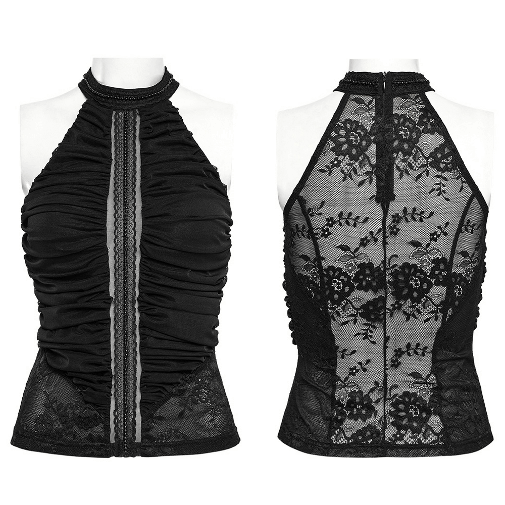 Sophisticated Gothic Pleated Halter Neck Top Featuring Lace Accents
