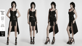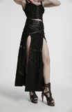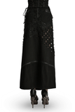 This bold punk skirt combines twill weave, perforated fabric, and rubberized faux leather for a fierce look. High side slits bring a daring edge, while the detachable hem allows it to transform into a mini skirt for styling flexibility. Accented with loops and metal studs, it delivers striking detail and attitude, perfect for adding standout flair to any alternative outfit.