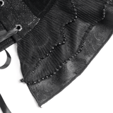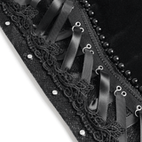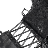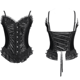 This gothic lace corset blends striking black satin with intricate lace accents. Designed with satin lacing, structured support, and ruffled hem trim, it creates a dramatic silhouette. The adjustable straps provide a custom fit, while the back lacing sculpts an elegant hourglass shape. A perfect piece for gothic fashion, vintage-inspired looks, or statement evening wear.