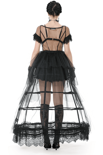 Sheer Tulle Punk Mini Skirt with Strap Accents Upgrade your alt wardrobe with this black gothic layered tulle mini skirt detailed with harness straps and bold metal accents. The tiered sheer mesh delivers a striking punk silhouette, while the faux...