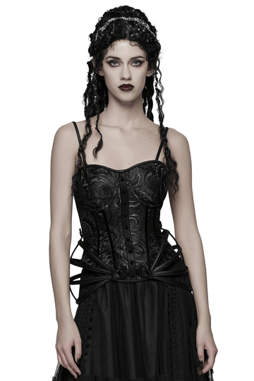 Gothic Rose Jacquard Corset with Removable Steel Boning This gothic rose corset is made from firm jacquard fabric with structured front and side panels for a sculpted silhouette. The adjustable lace-up back enhances shaping, while detachable steel boning adds both...