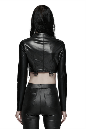 PU Leather Jacket with Bat Wing Collar and Fitted Silhouette This gothic cropped faux leather jacket is made from glossy rubberized knit fabric in a sleek slim-fit cut. The bold bat collar complements the pointed hem, while adjustable side drawstrings...