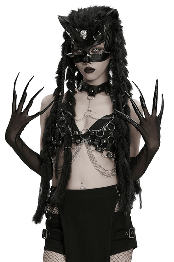Punk Fox Mask Hood with Braided Plush, Chains, and Latex Details Channel your untamed energy with this gothic fox hood mask crafted from eco-friendly plush, latex, and metal rivets. The bionic fox design radiates rebellious allure, while braided plush strands...