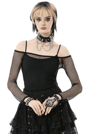 Stylish Off-Shoulder Goth Fishnet Long-Sleeved Top This chic Gothic mesh top showcases a striking off-shoulder cut, combining edgy fishnet fabric with long sleeves. Its light, breathable material adds a distinctive touch to any alternative wardrobe, while the bold, versatile design...