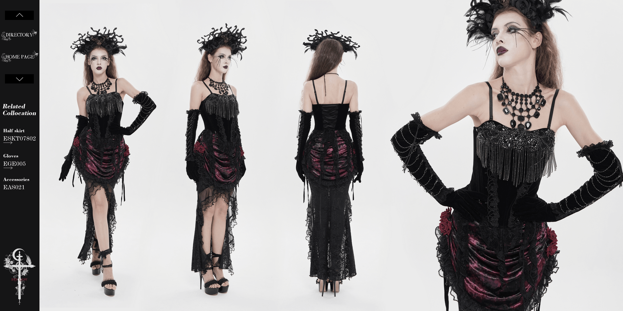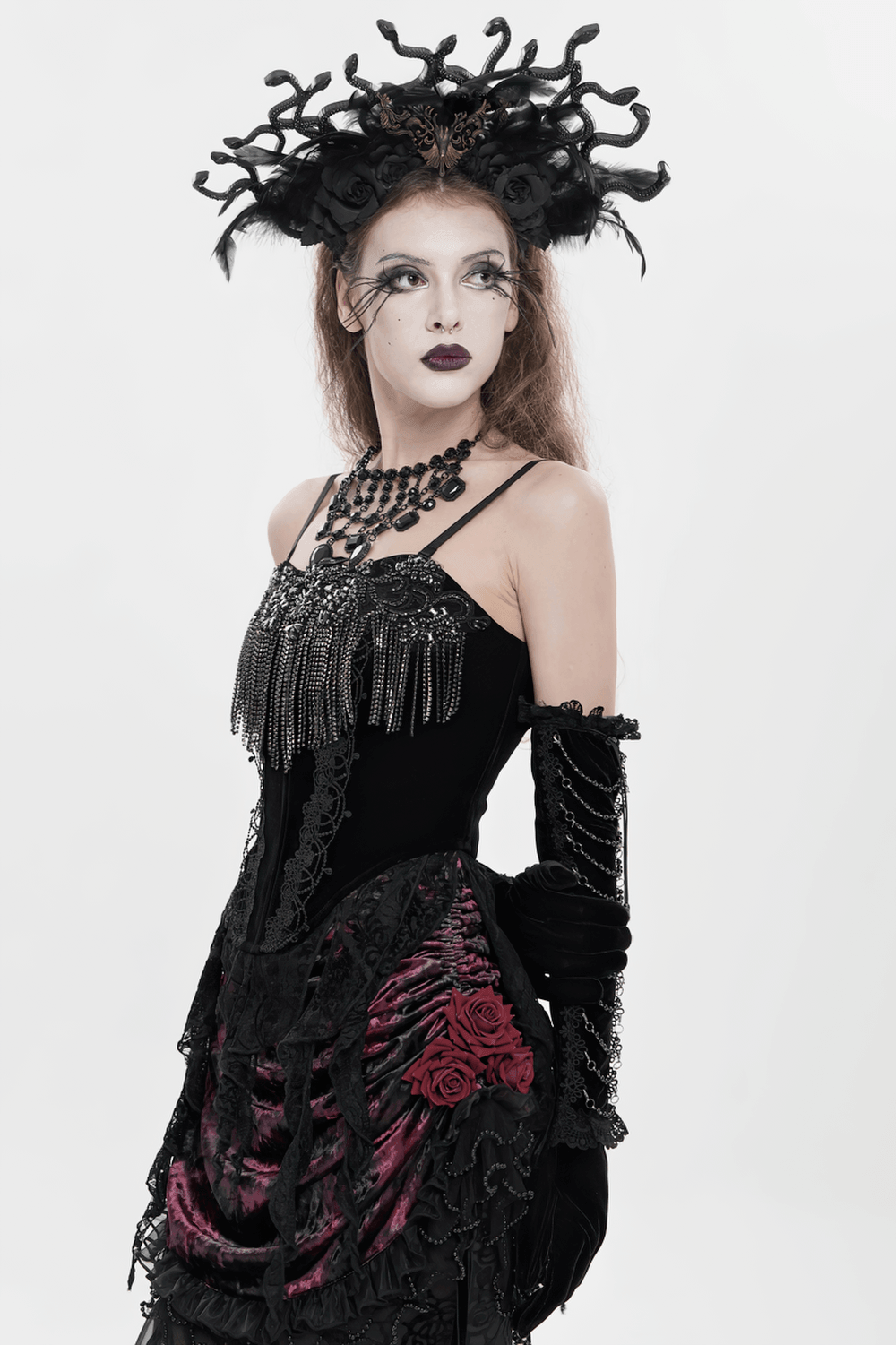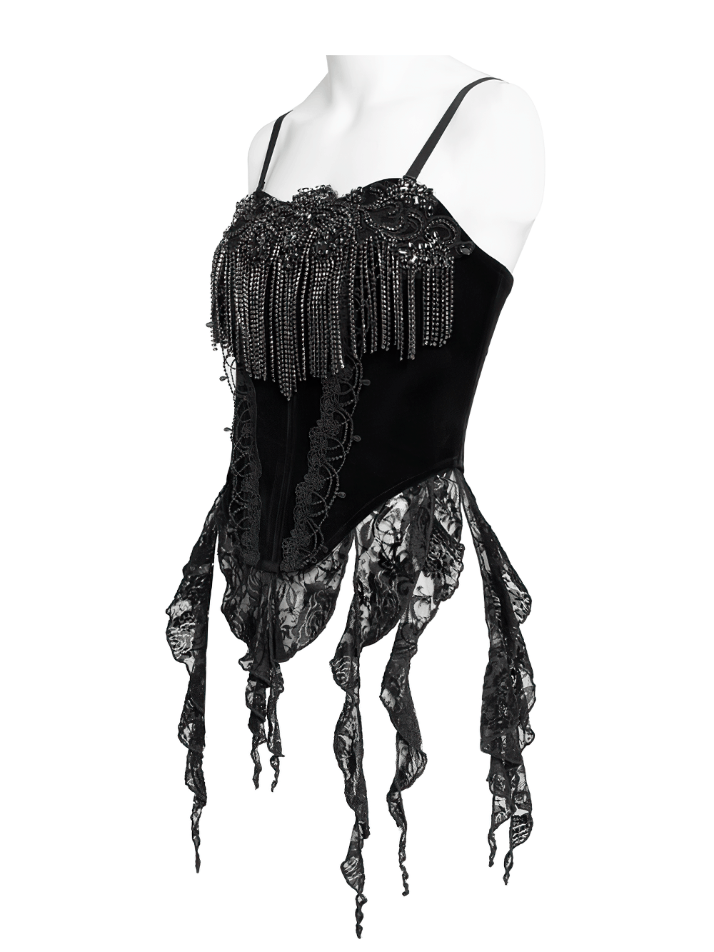 Enter dark mystery in this noir gothic corset top boasting a tailored velvet base, lace-up rear, flexible shoulder straps, and striking lace drapes on the hem. The ornate beaded fringe neckline and lace edge design a cinematic silhouette that works perfectly with long skirts, stacked jewels, and elegant gloves for gothic events, evening dressing, and alternative fashion styles at night.