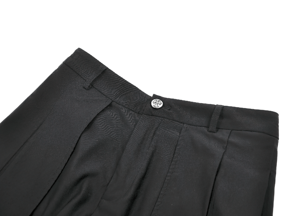 These black gothic shorts showcase mesh netting at the hem and a tailored suspended silhouette for a striking look. An adjustable belt with metal buckle fastenings delivers a secure fit while adding an industrial edge. With multiple pockets, this piece blends standout style with everyday function, making it perfect for alternative fashion fans who want both utility and a bold statement.