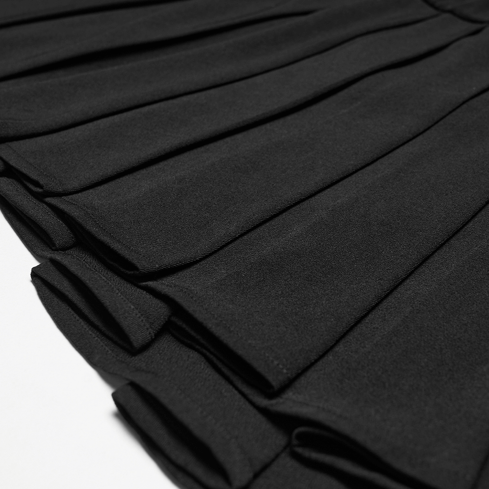 Enter neon-night energy, with this black chiffon pleated skirt. A striking rubber patch panel on the front brings industrial attitude, while side waist buckles define the silhouette. The elastic waistband at back keeps it secure for club nights, gigs, and streetwear looks. Style with boots, harness tops, or techwear layers. Lightweight chiffon sways, and the front panel amplifies cyberpunk edge daily.