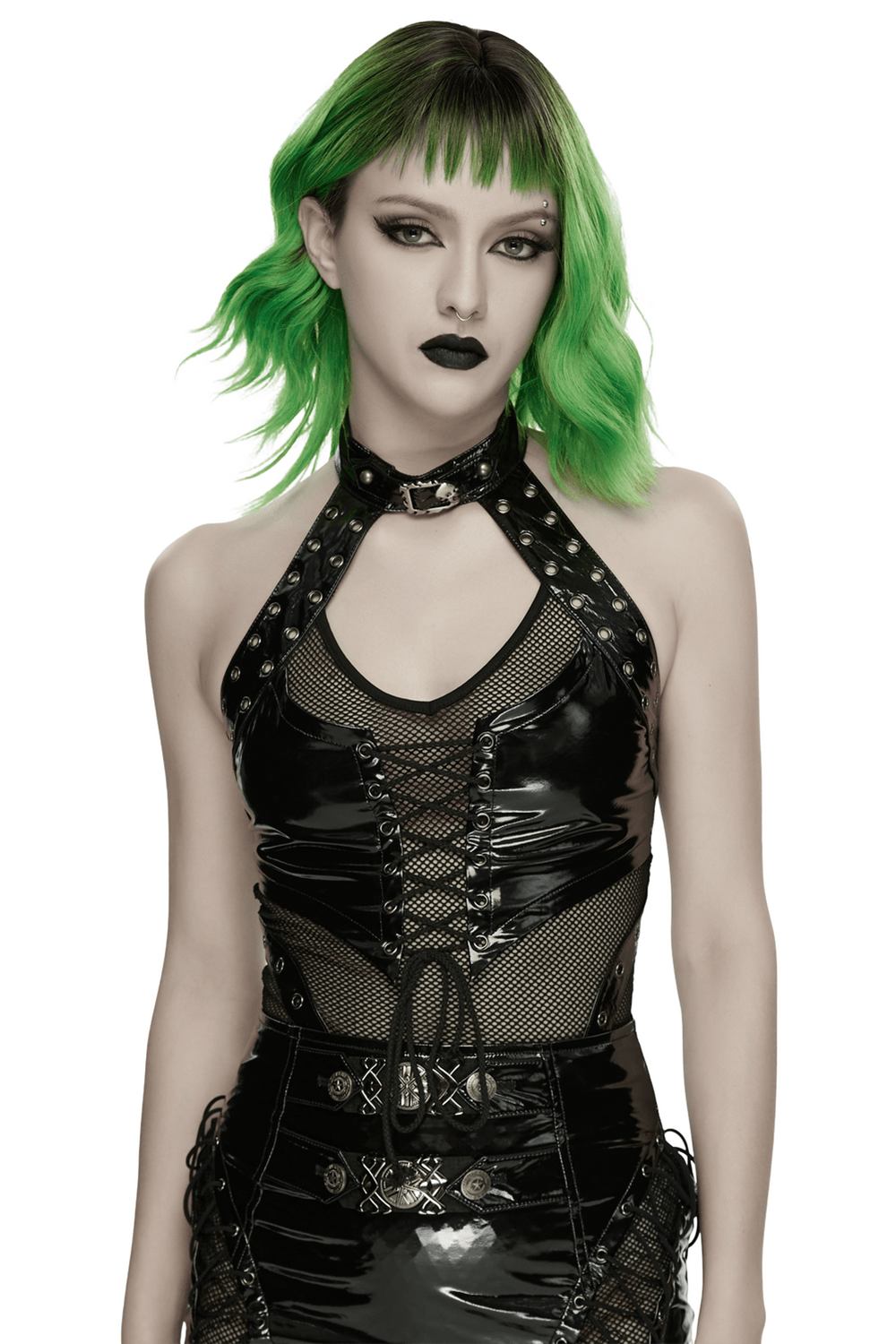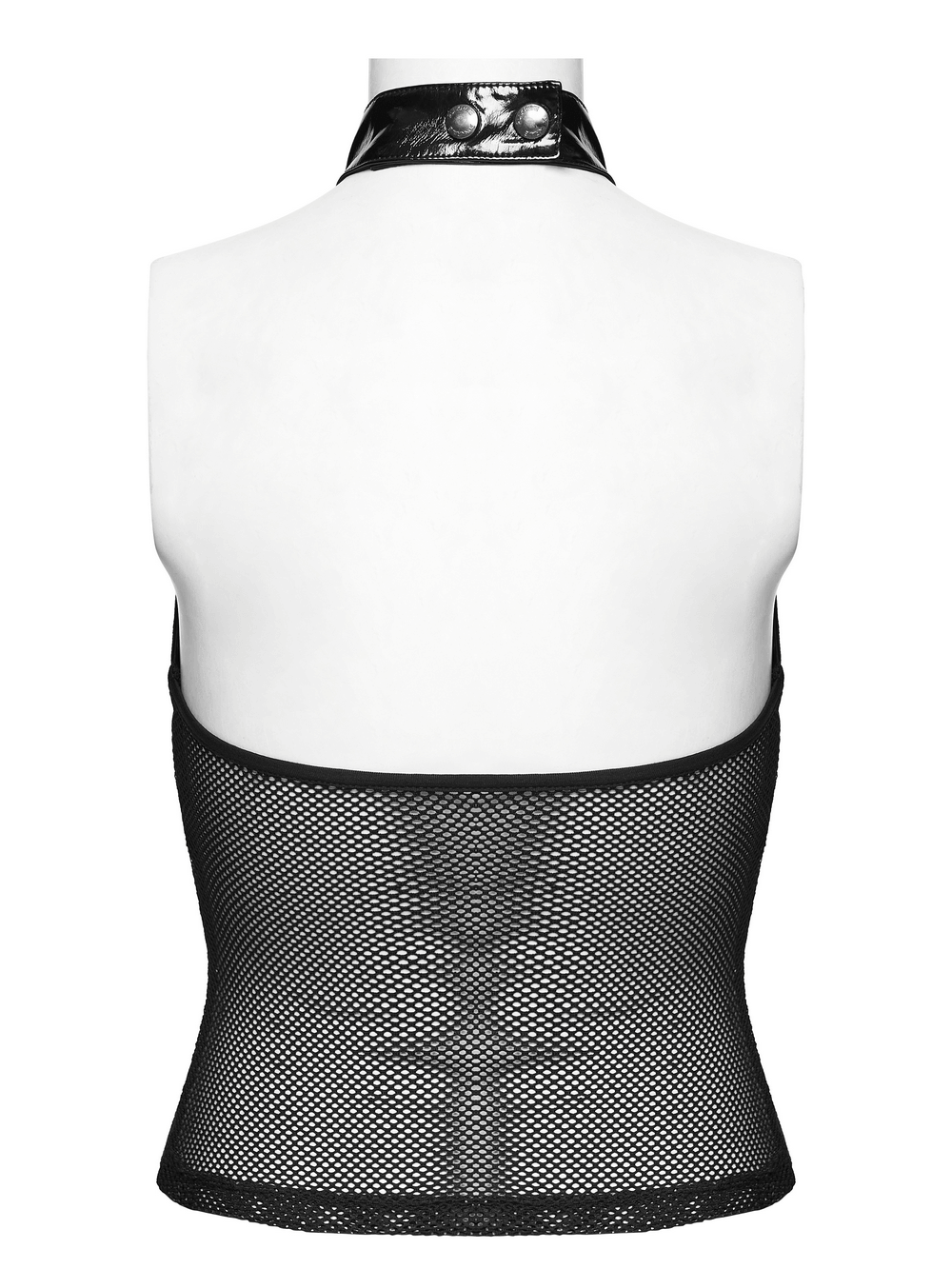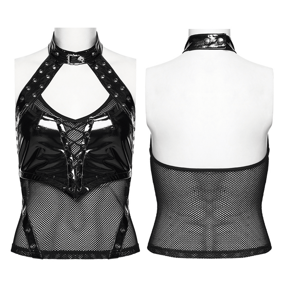 Turn up your look with this women's punk halter top in glossy patent leather and mesh. The front features a bold hollow segmented design that adds a sharp, casual edge, while the adjustable lace-up detail with metal eyelets shapes the fit. A snap button back collar secures the neckline, making this statement top a standout pick for clubwear, festivals, concerts, and alternative styling after hours.