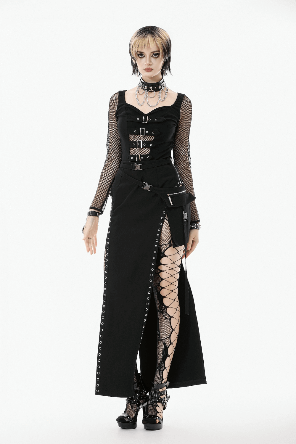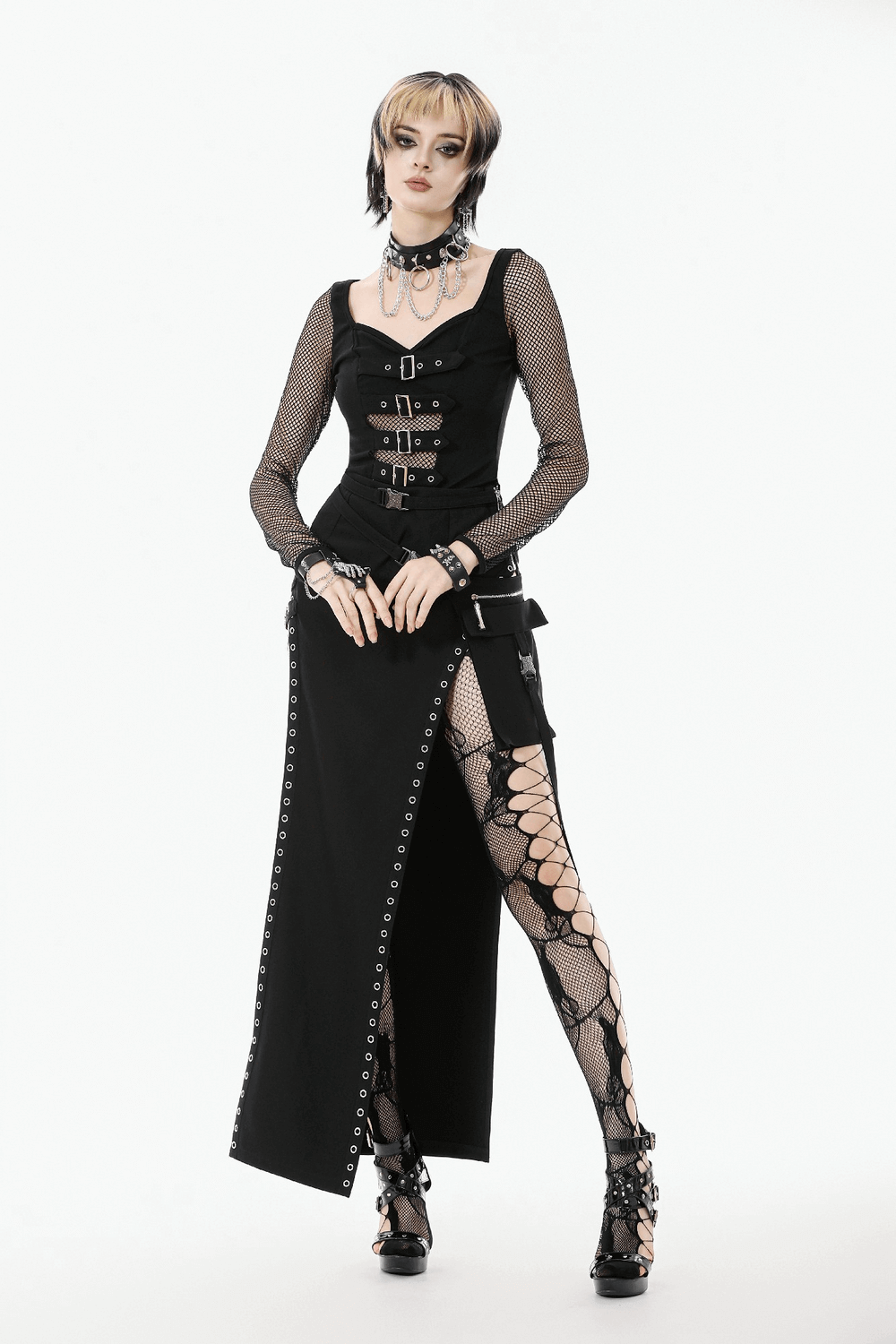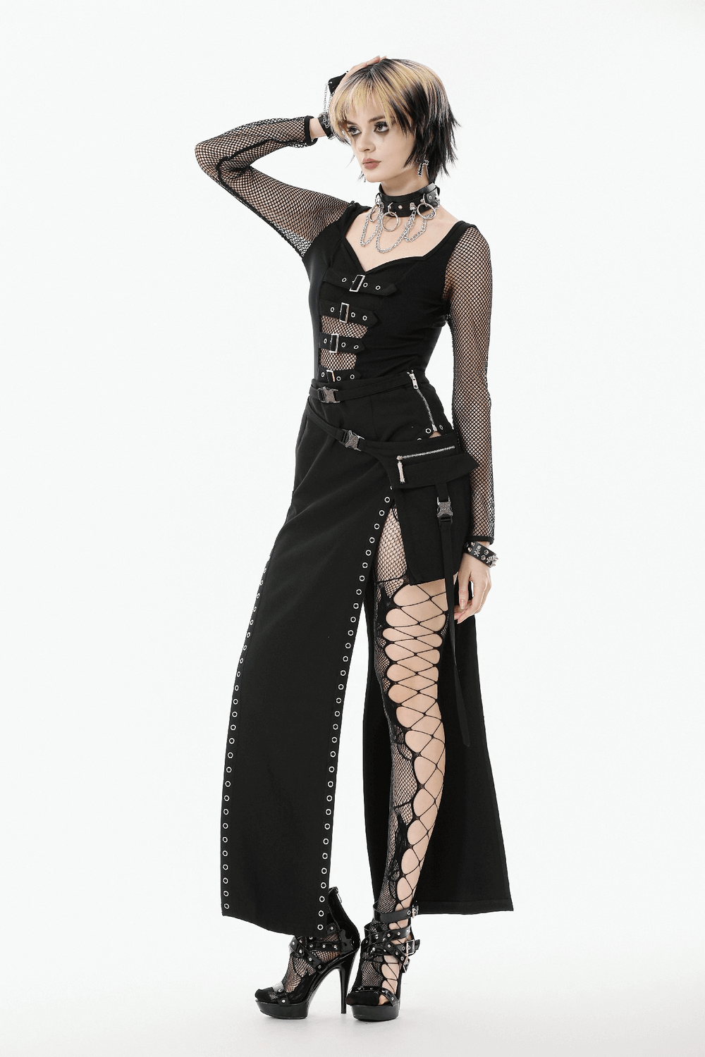 This gothic maxi skirt offers a sharp, sculpted shape with an angled slit, metal grommet edging, and layered strap accents. The wrap-style waist with adjustable buckles brings an industrial edge, while the long straight profile forms a dramatic alt-fashion vibe. Ideal for goth, punk, and cybergirl-inspired ensembles.