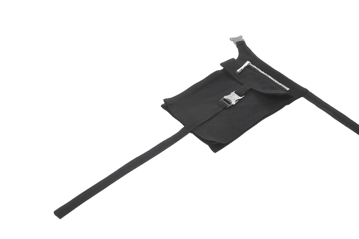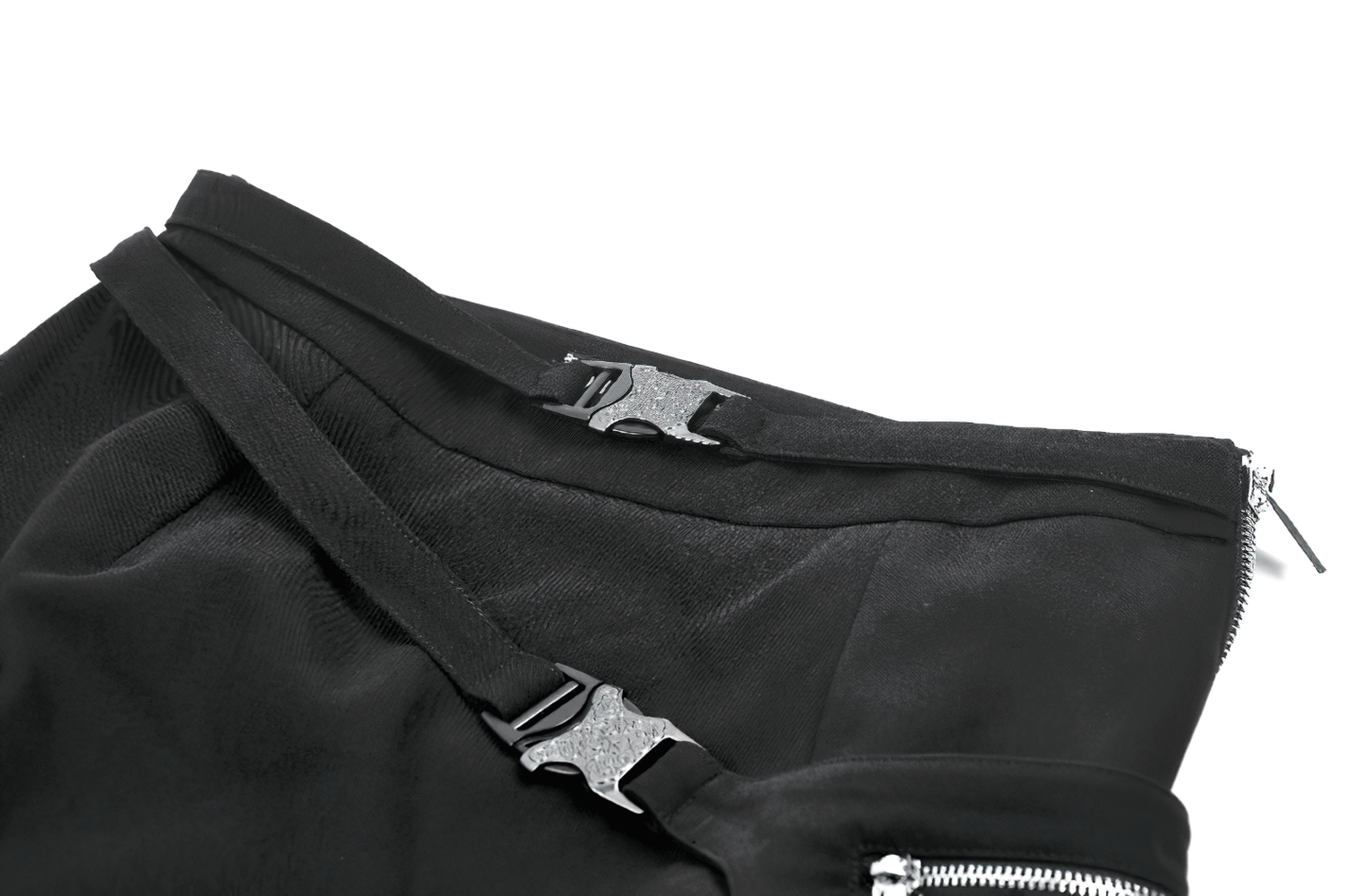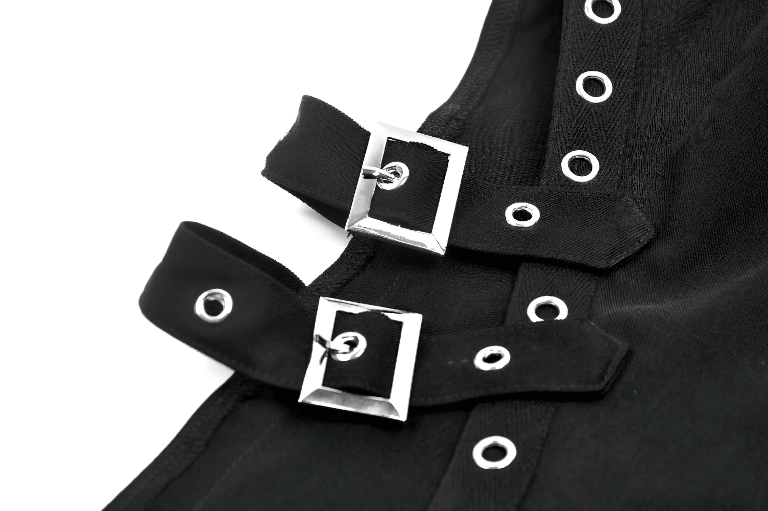 This gothic maxi skirt offers a sharp, sculpted shape with an angled slit, metal grommet edging, and layered strap accents. The wrap-style waist with adjustable buckles brings an industrial edge, while the long straight profile forms a dramatic alt-fashion vibe. Ideal for goth, punk, and cybergirl-inspired ensembles.