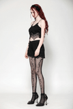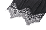 This sleek black camisole showcases ribbed fabric and lace accents on the hem and straps, creating a perfect mix of elegance and edge. With adjustable straps for a tailored fit, the romantic lace contrasts beautifully with the bold style. Great for gothic, punk, or alt fashion, this versatile top pairs effortlessly with high-waisted skirts, leggings, or shorts.