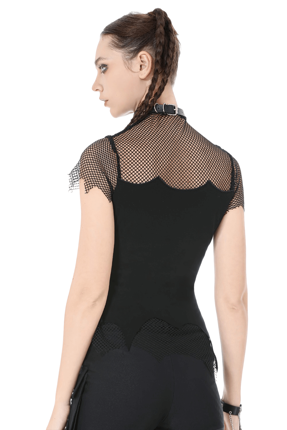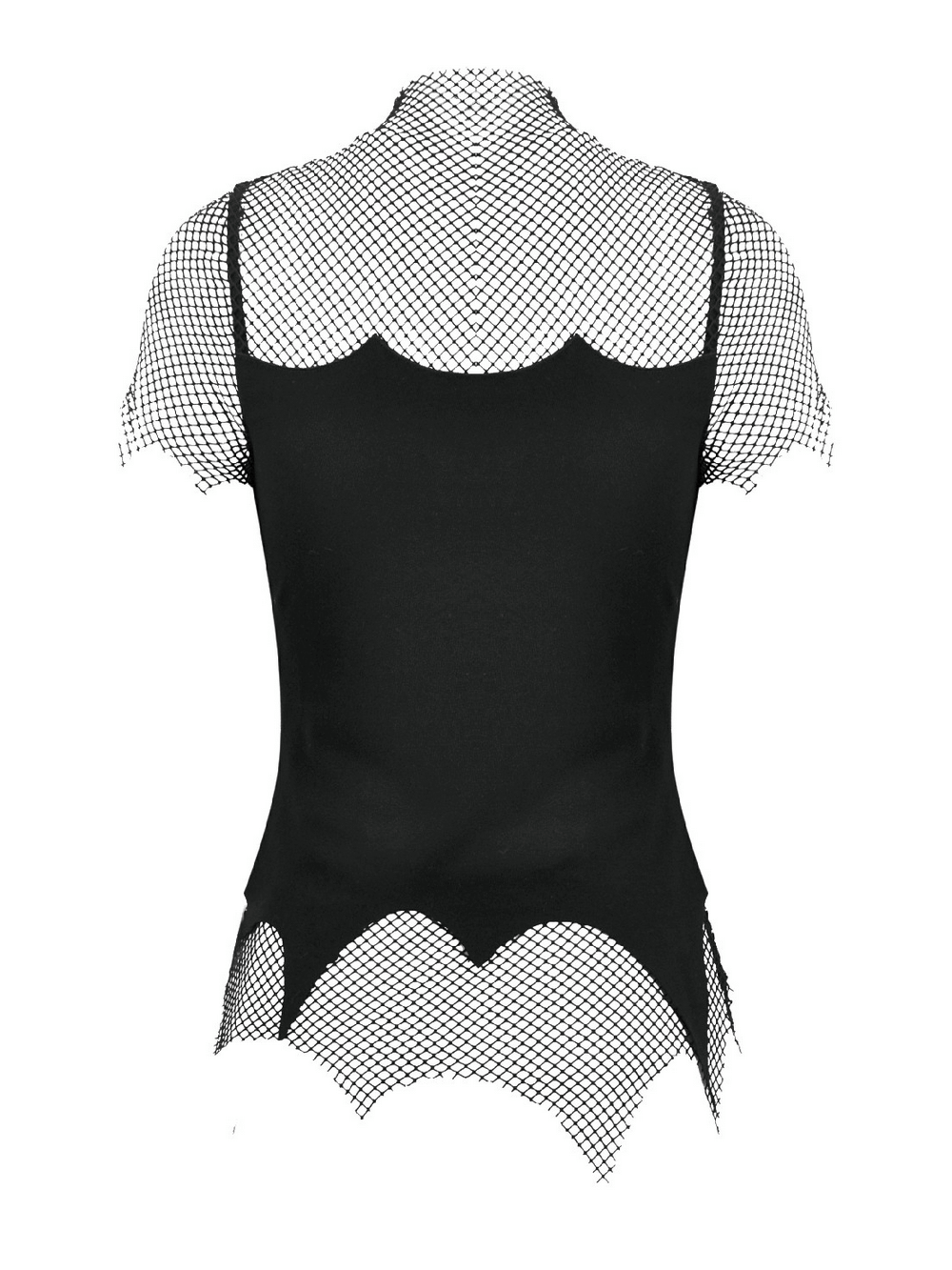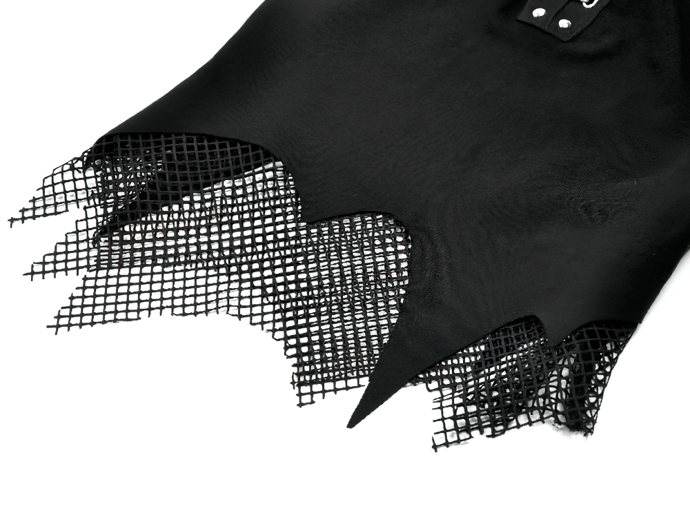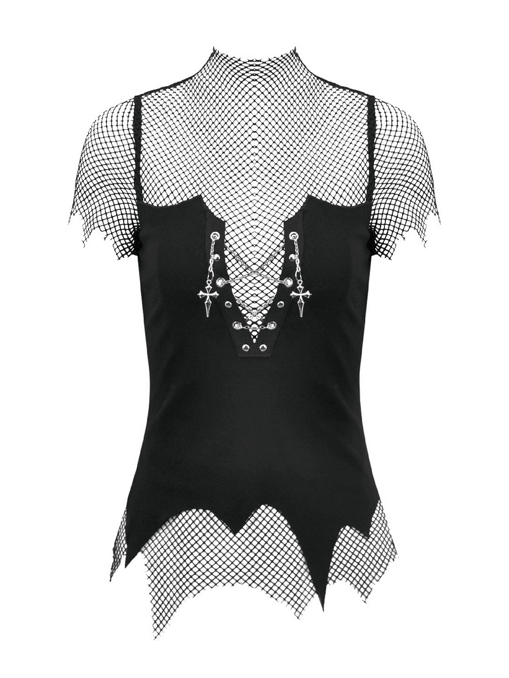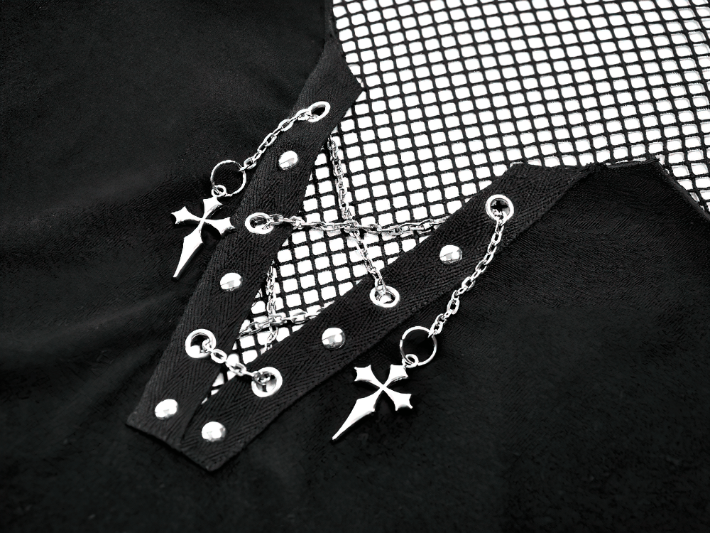 Command attention in this gothic cami featuring an integrated mesh high neck and cap sleeves. A lace-up V front detailed with metal eyelets and cross charm chains delivers bold, dark attitude. The fitted stretch knit base layers seamlessly under jackets, corsets, or harnesses for club nights, concerts, festivals, and alternative streetwear edits. Mesh edging forms a jagged hem for added edge. Adjustable straps refine the fit precisely.