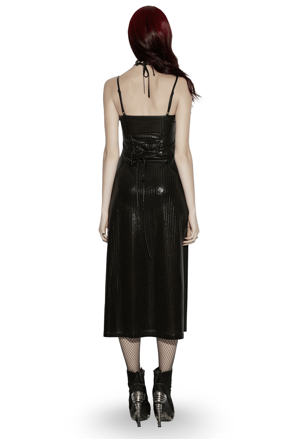 Craft a presence in this goth slip dress made from shiny stretch striped woven fabric. The slim silhouette is enhanced by a bold star-shaped collar with halter neck details, while the flexible drawstring at the rear waist adjusts the fit. The gradient silver effect builds a mermaid-inspired luster, while the black edition maintains a dense dark vibe for a fiercer gothic feel in pure black.