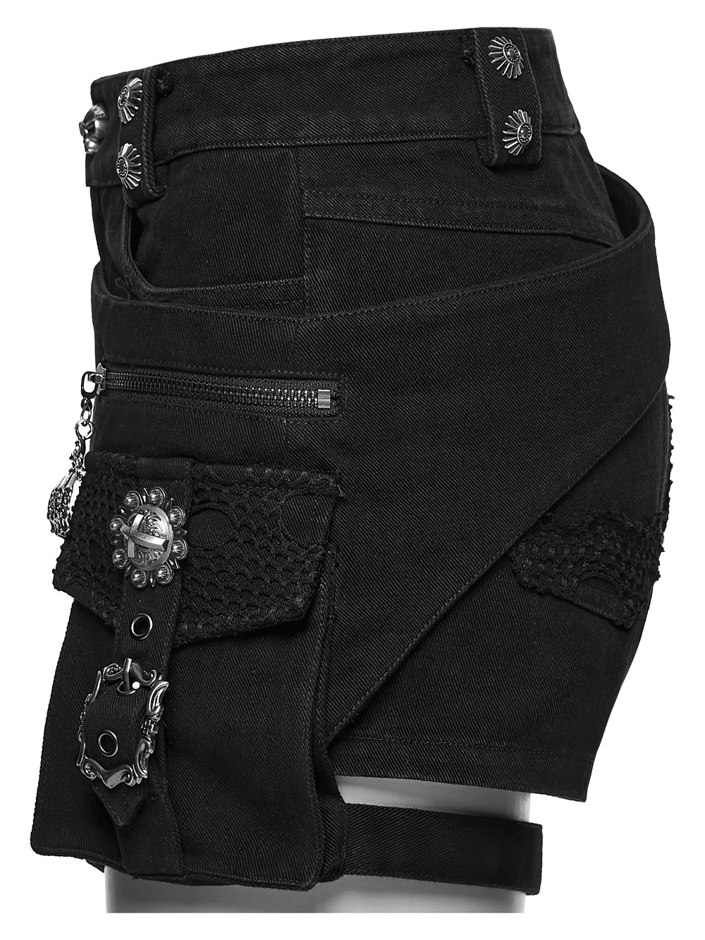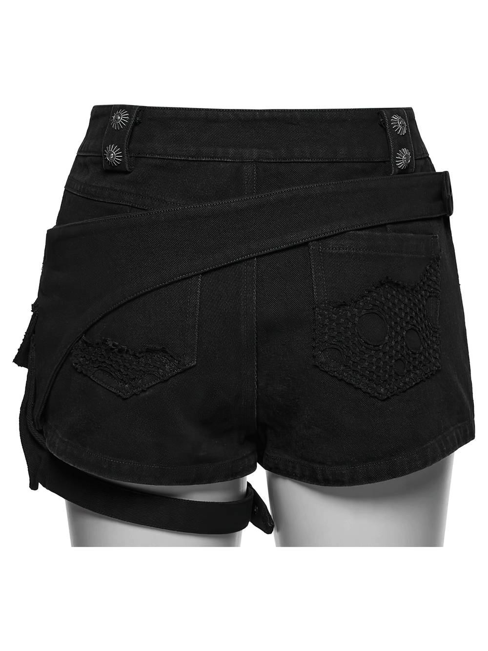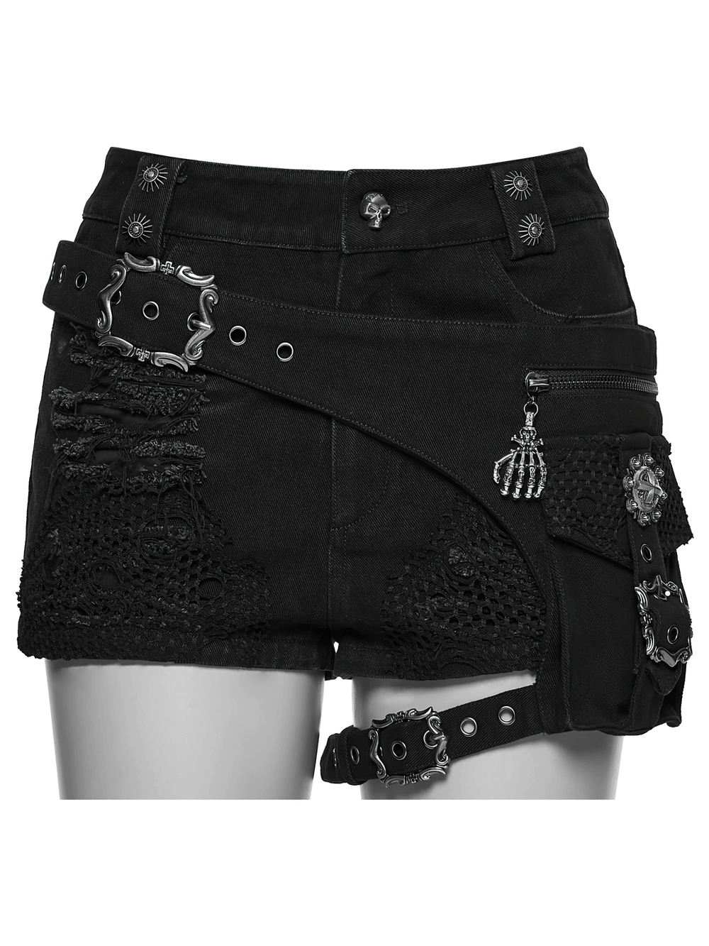 Rigid denim shorts with mesh inserts and scorched distressing for a fierce punk mood. A removable side pouch and adjustable leg strap shift your look fast from streetwear to clubwear. Frayed panels and mixed metal trims deliver a hardcore finish. Pair with fishnets, platform boots, or a harness top for instant alt attitude and styling. Wrapped belt detail outlines the hips and boosts your silhouette.