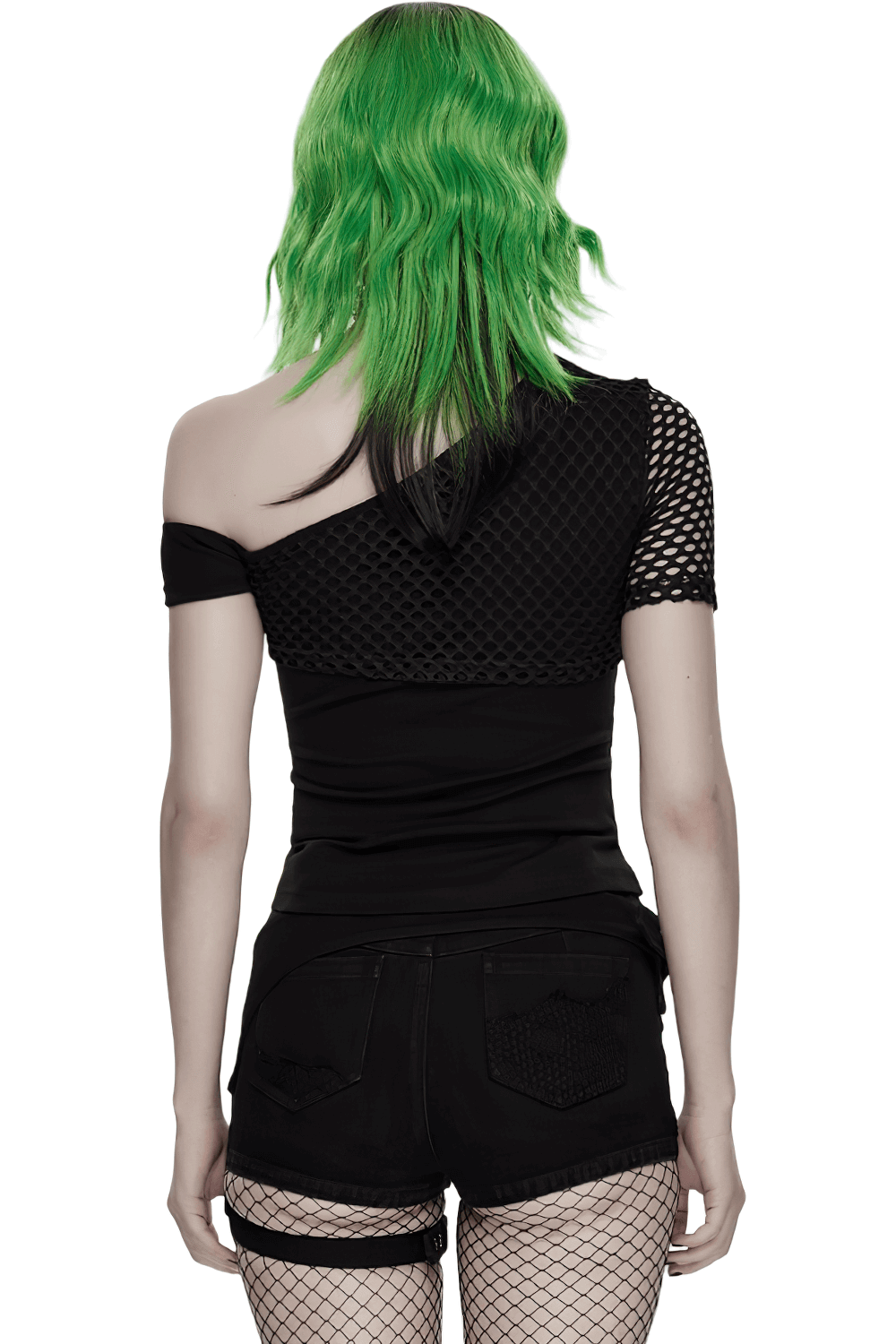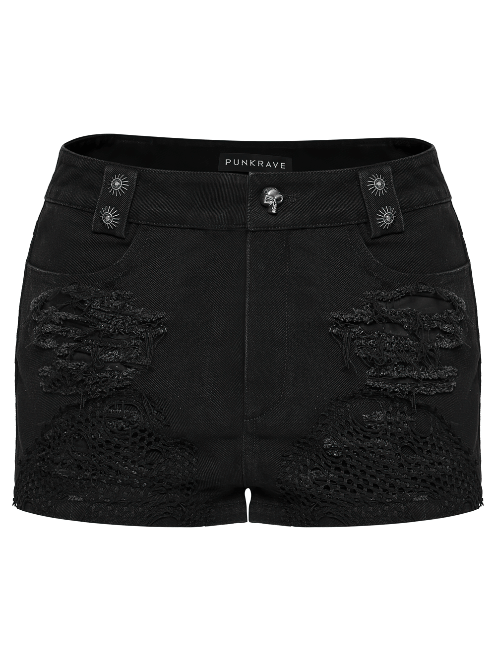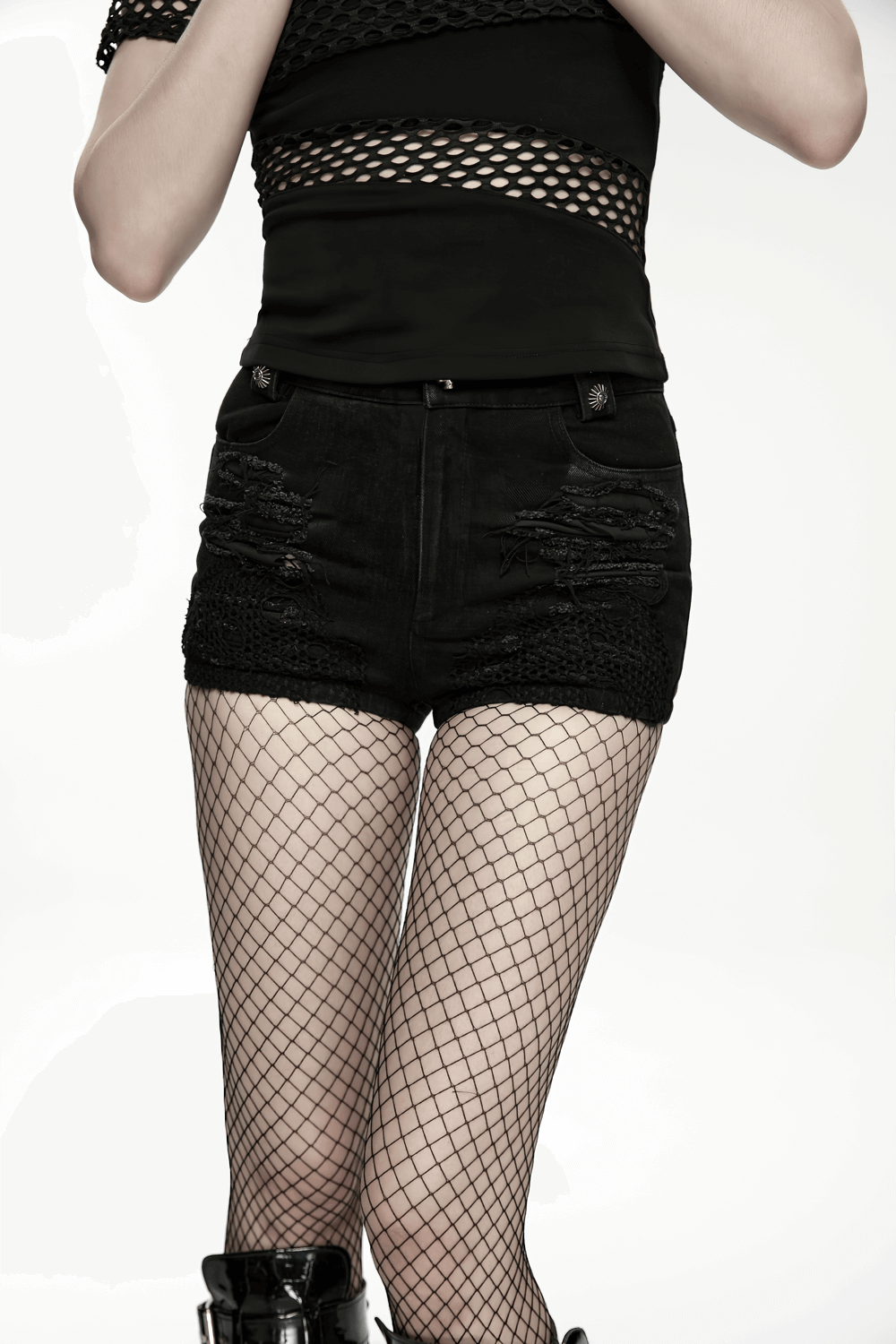 Rigid denim shorts with mesh inserts and scorched distressing for a fierce punk mood. A removable side pouch and adjustable leg strap shift your look fast from streetwear to clubwear. Frayed panels and mixed metal trims deliver a hardcore finish. Pair with fishnets, platform boots, or a harness top for instant alt attitude and styling. Wrapped belt detail outlines the hips and boosts your silhouette.