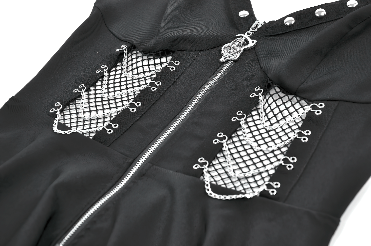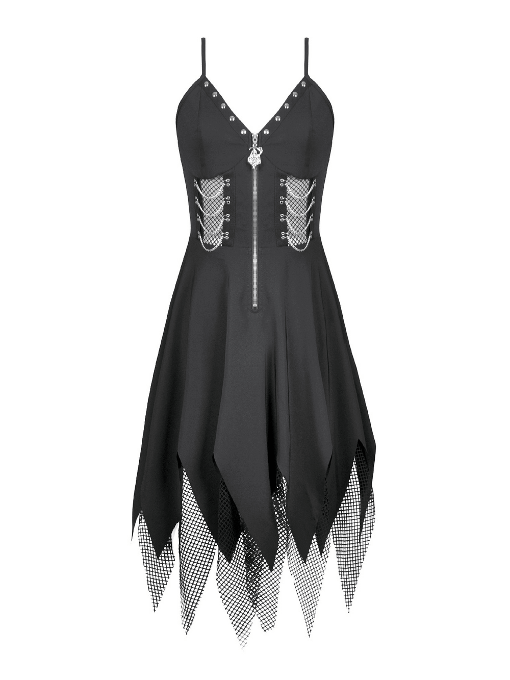 Rule the night in this gothic dress with bold zip front and studded neckline. Fishnet lace-up side panels bring punk edge, while the jagged hanky hem is layered in mesh for a torn-up silhouette. Adjustable straps and a smocked back panel let you fine-tune the fit. Wear with boots, gloves, or a choker for club nights, Halloween, and concerts. Pair with fishnets and a harness belt for bite too.