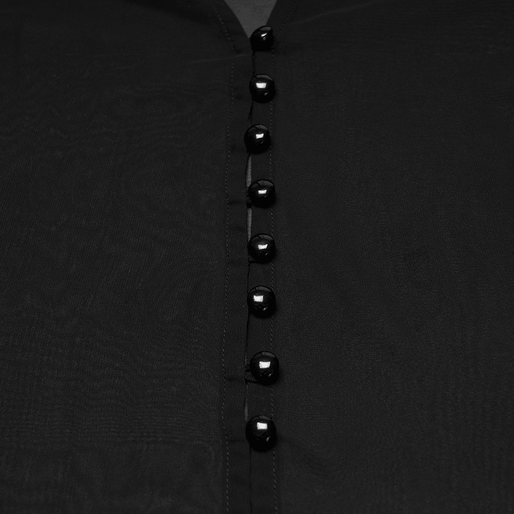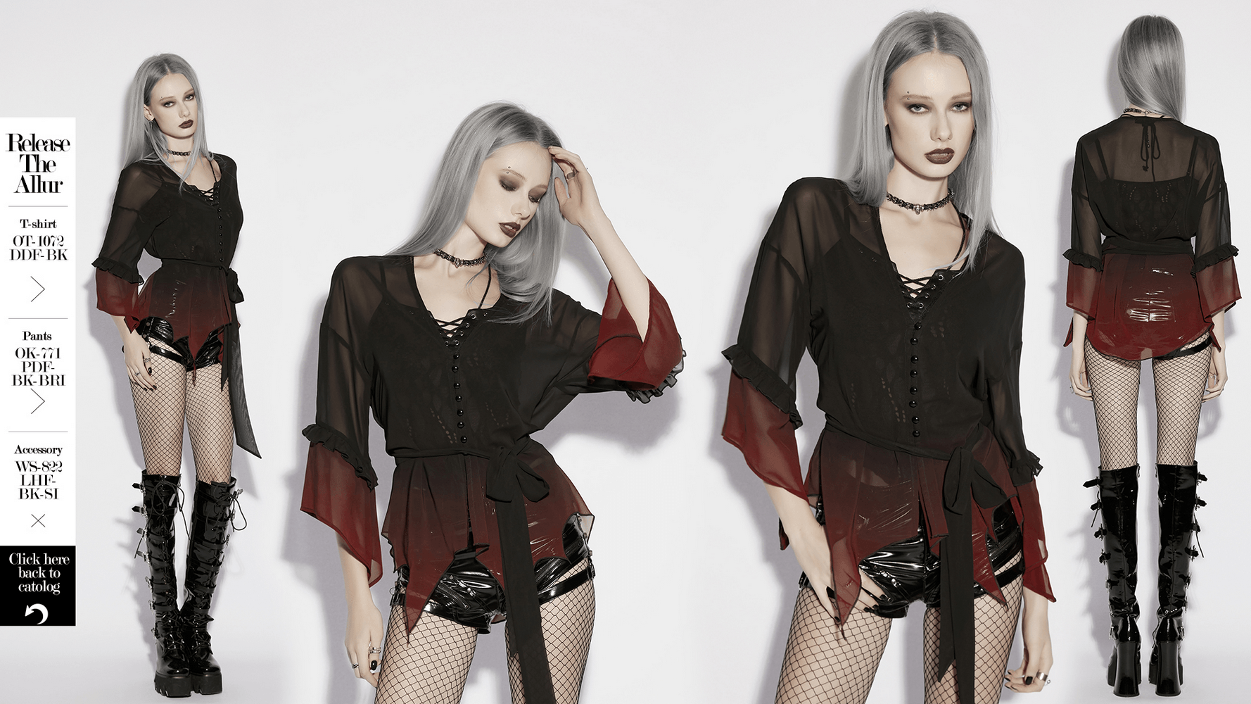 Women's sheer chiffon cape features an ombre finish, deep V neckline, front button accents, and a tie waist belt. Billowing wide sleeves with ruffled trim and an uneven hem shape a dramatic gothic silhouette. A standout layer for festival styling, boudoir looks, witchy outfits, and dark alternative wardrobes craving bold motion and sheer texture day to night with bold gothic flair.