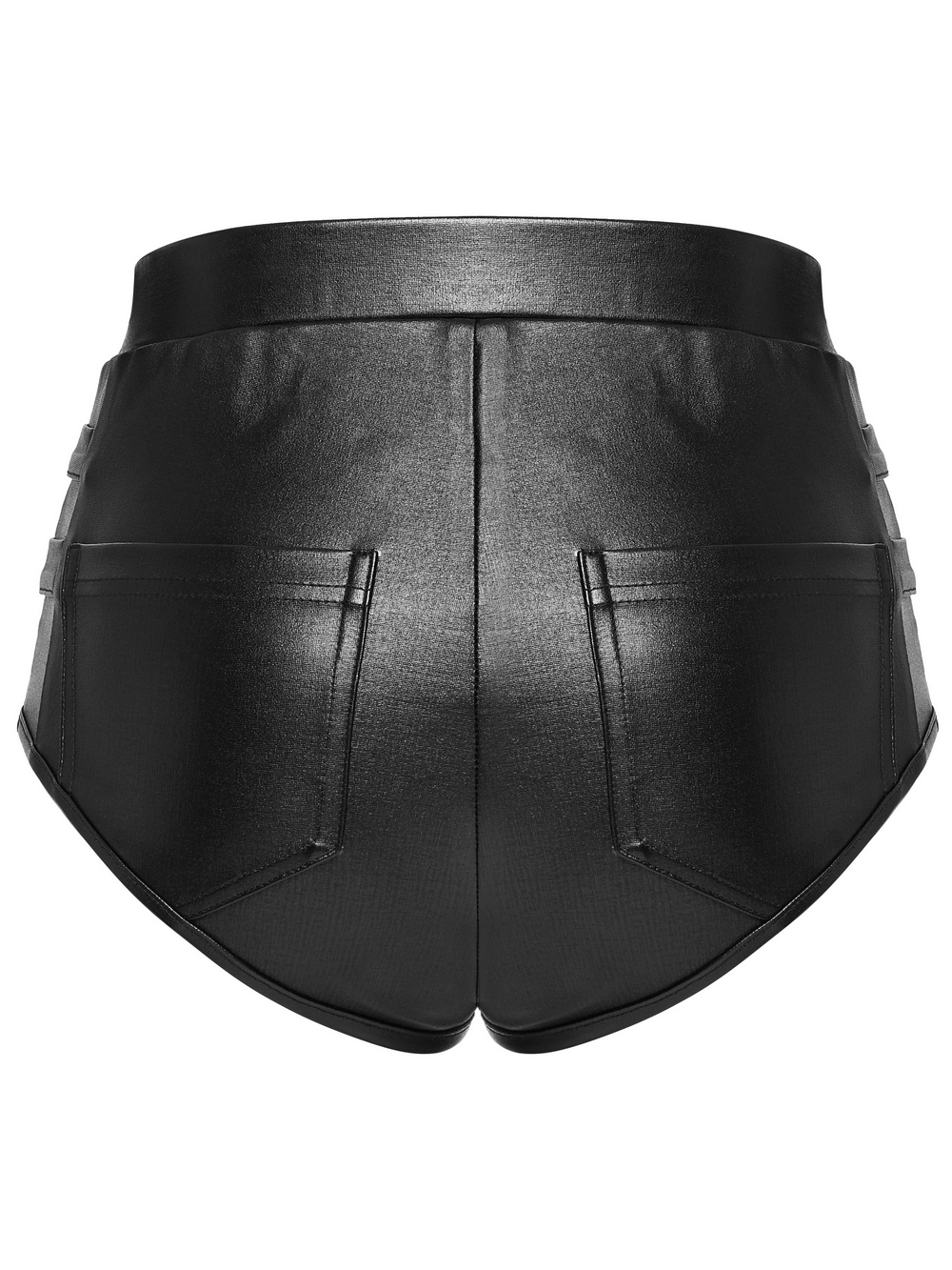 Turn up your after-dark look with these black punk faux leather hot pants. The high-rise cut frames the waist, while studded side panels and button detailing add sharp metal attitude. Contoured seams shape a sleek silhouette, and rear patch pockets bring utility edge. Style with fishnets, platform boots, or a cropped jacket for club nights, festivals, and alt streetwear fits. Ready for bold looks.