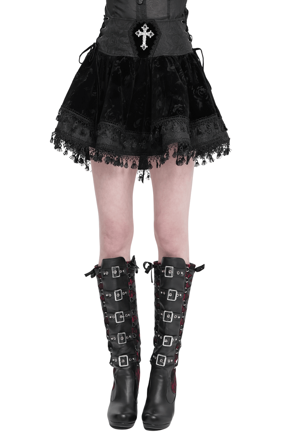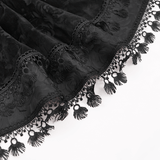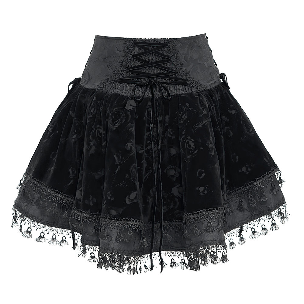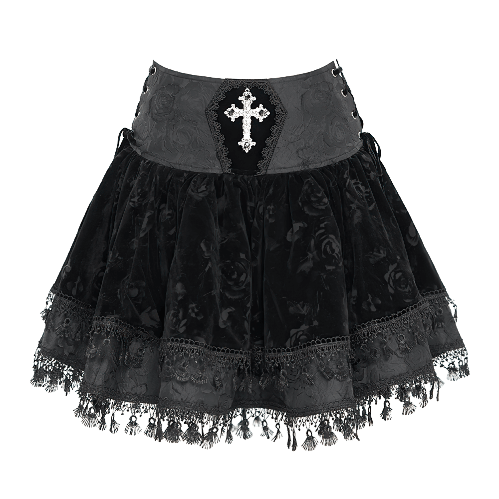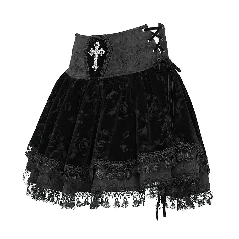 This high-waisted gothic velvet skirt showcases a vintage corset-style waistband with elegant lace-up accents for a customizable fit. An embroidered cross makes a striking focal point, while lace trim and a tassel hem elevate its Victorian flair. Made from a blend of polyester and polyamide, this flared design is ideal for gothic, steampunk, and alternative fashion lovers.